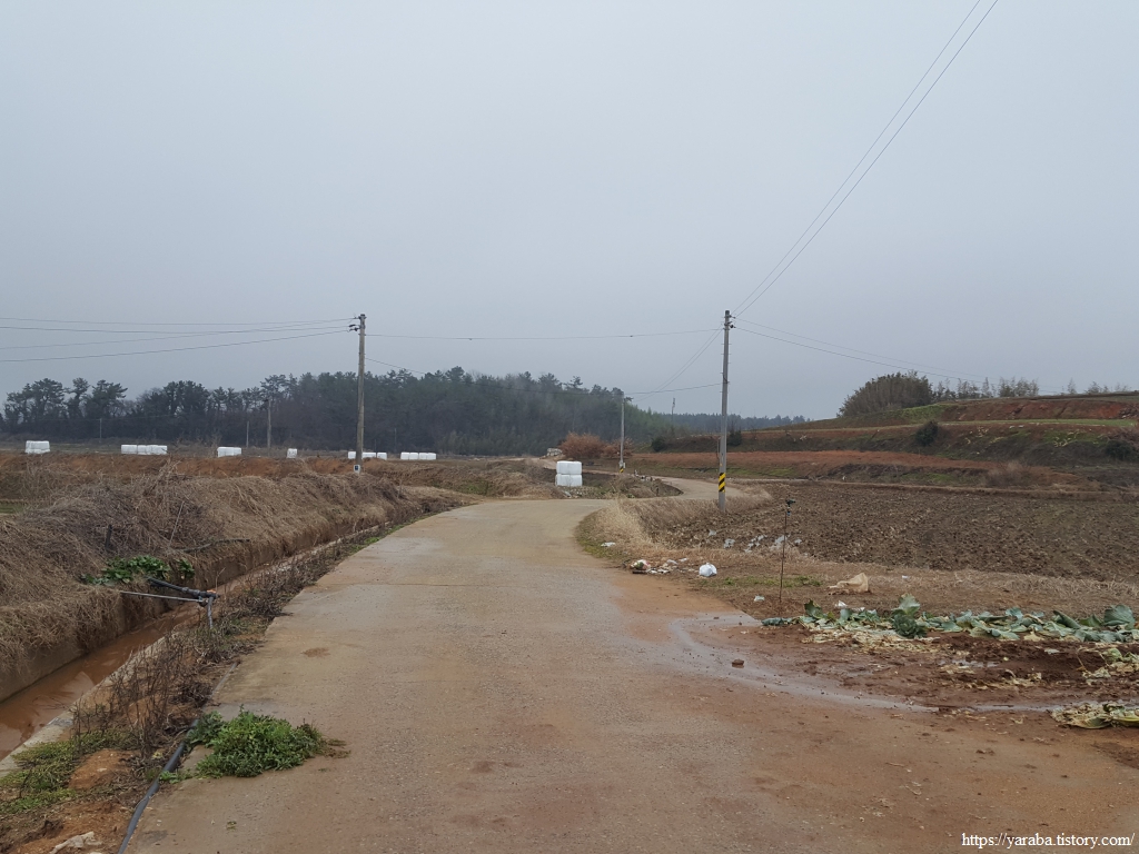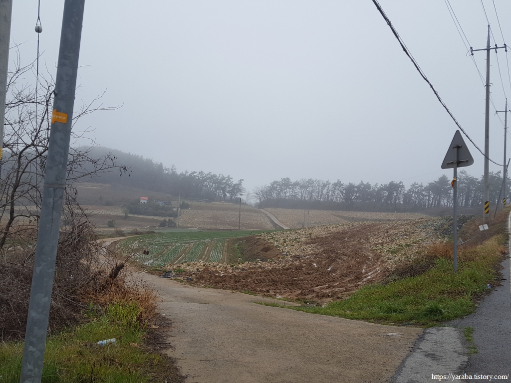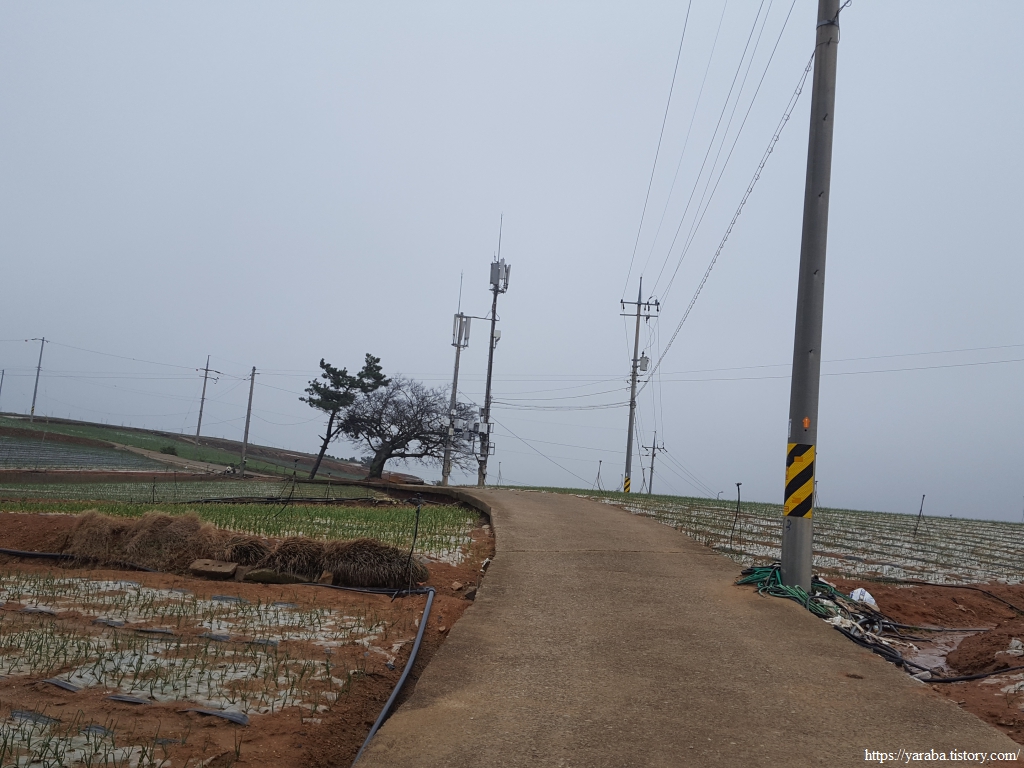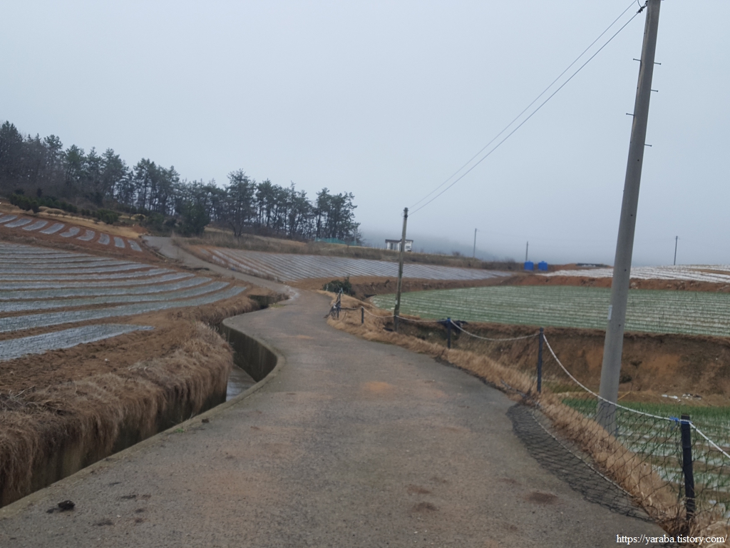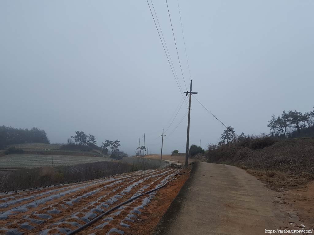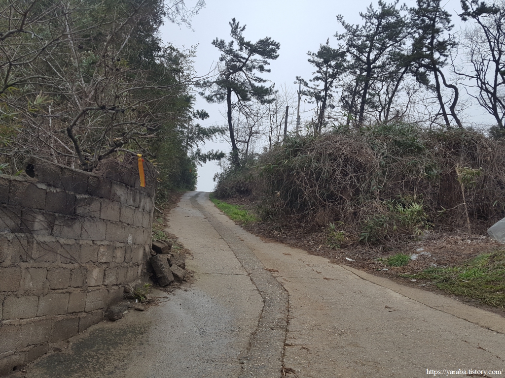 아름다운 숲길이 있었던 백학산 임도를 벗어나 신사마을 앞의 구릉지를 걷는 길은 언덕길을 내려가 해안 평야지대로 향한다.