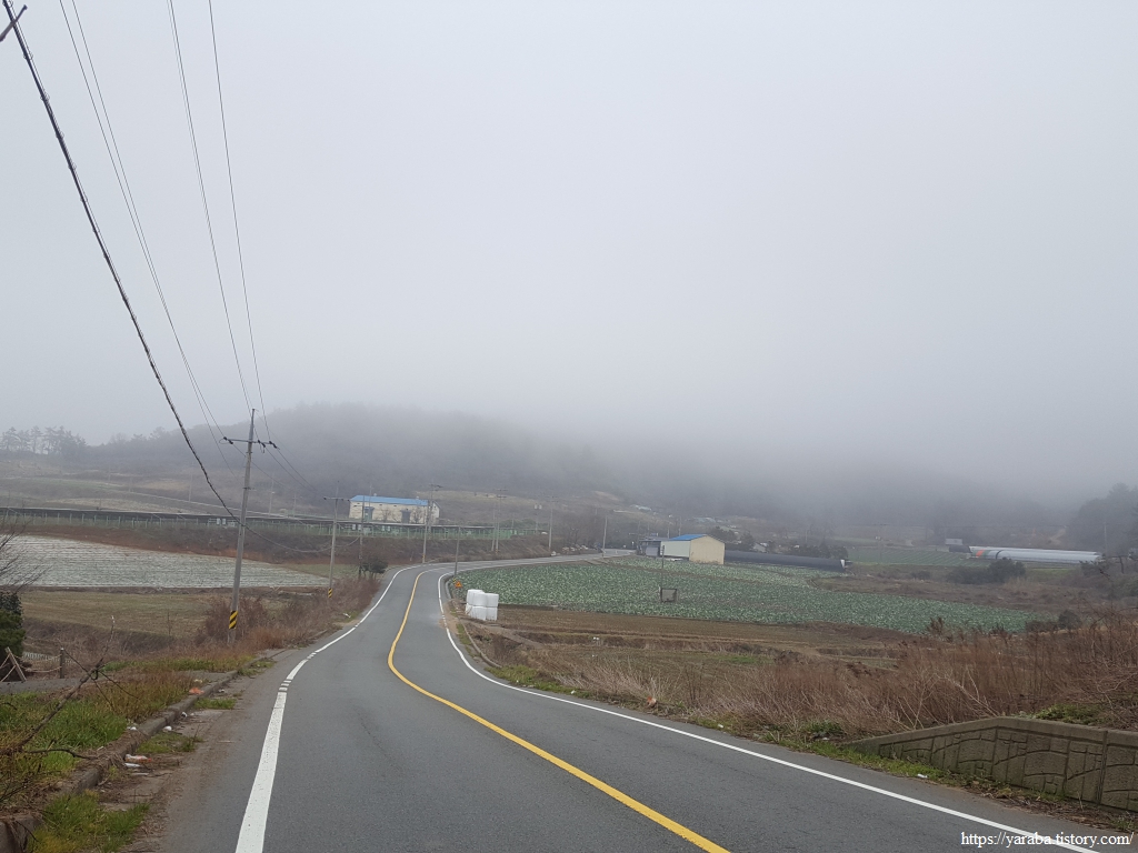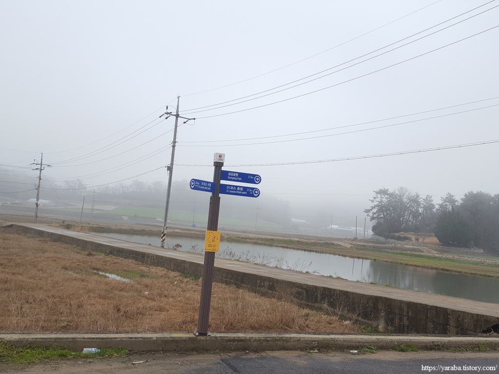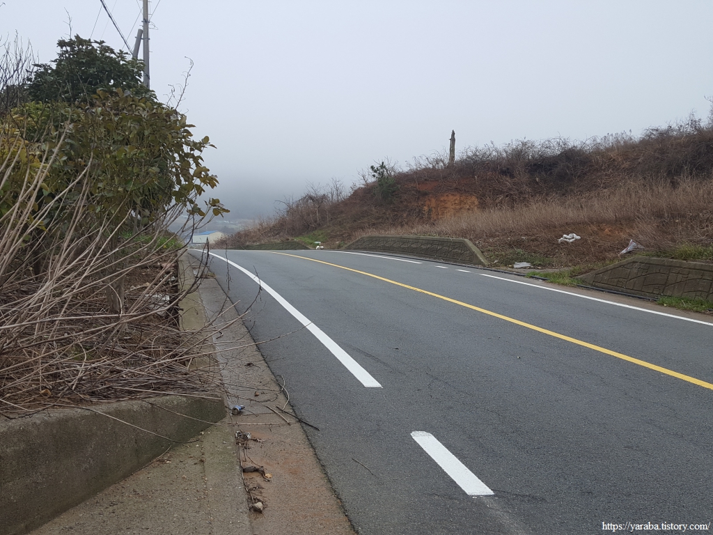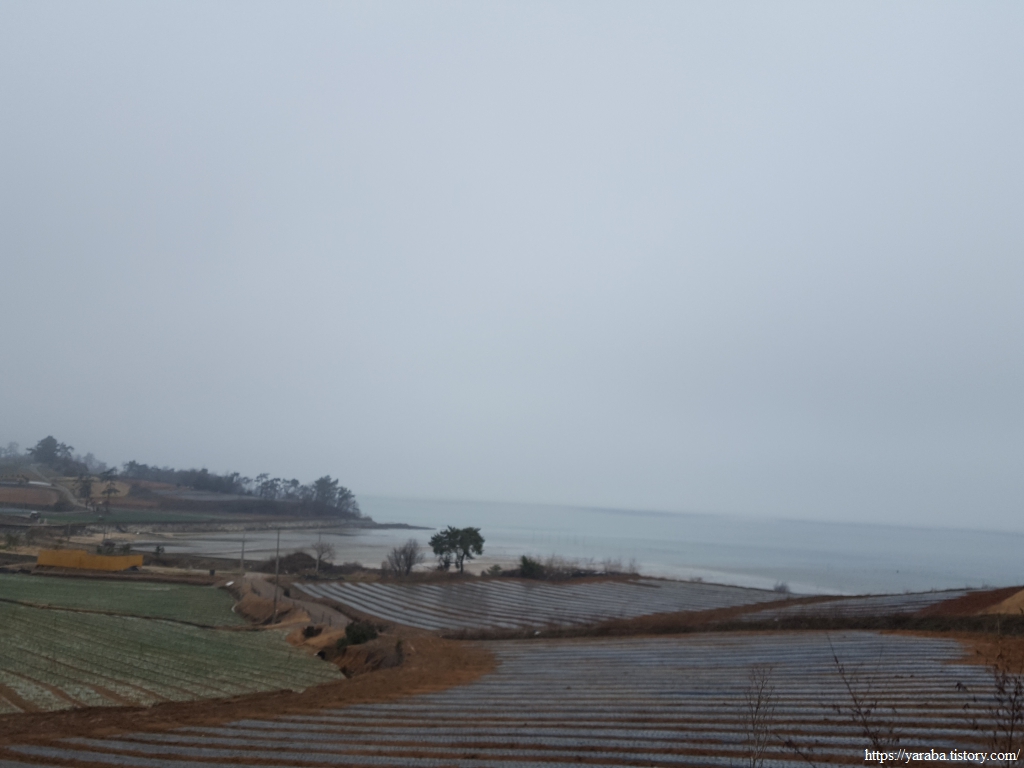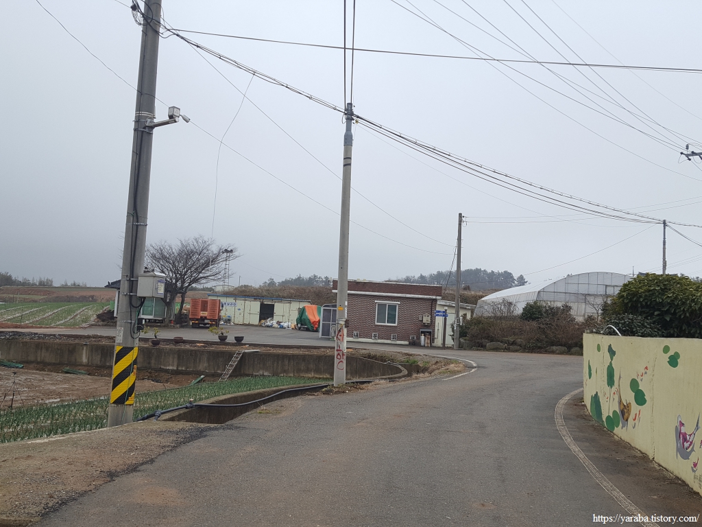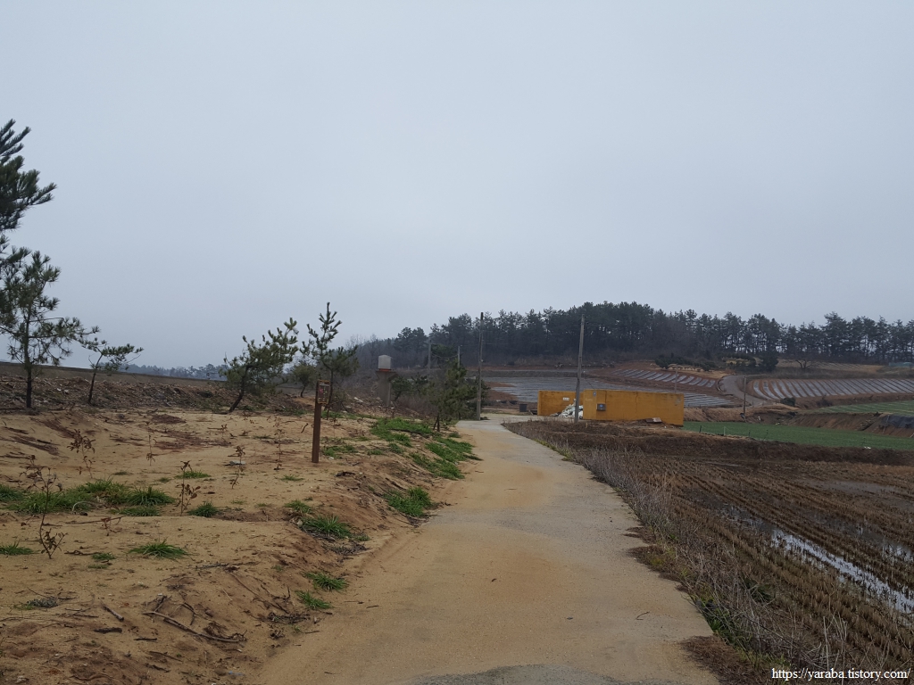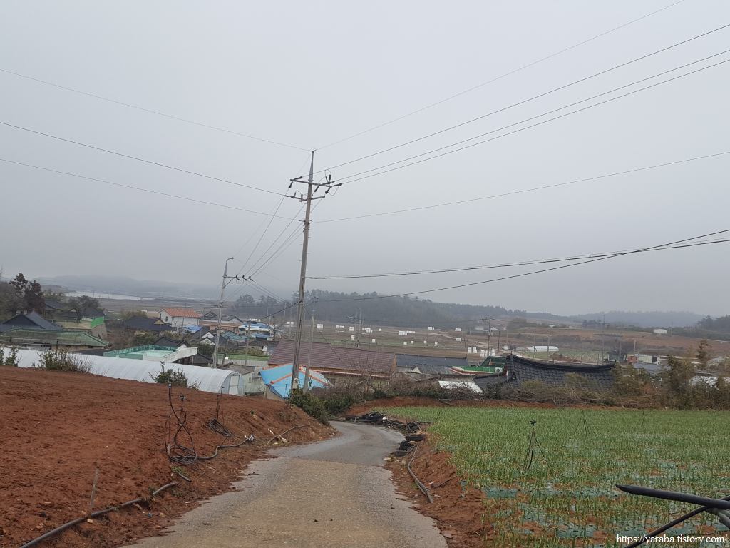 아름다운 숲길이 있었던 백학산 임도를 벗어나 신사마을 앞의 구릉지를 걷는 길은 언덕길을 내려가 해안 평야지대로 향한다.