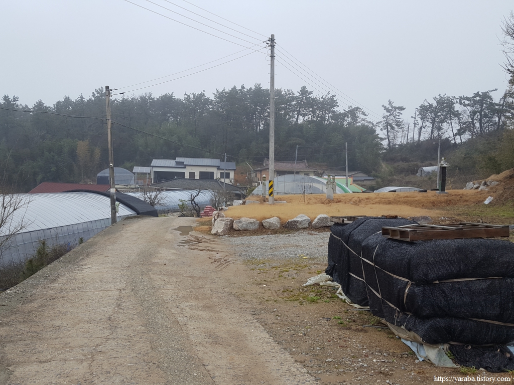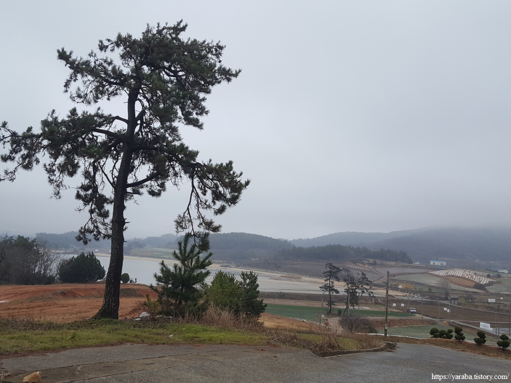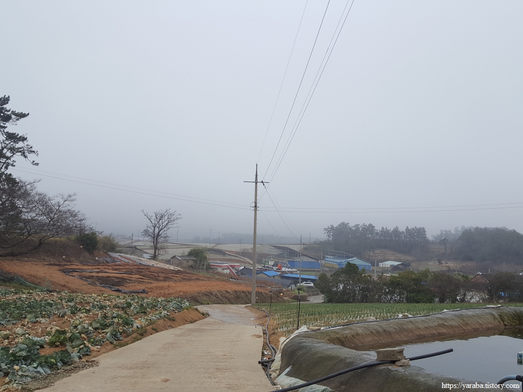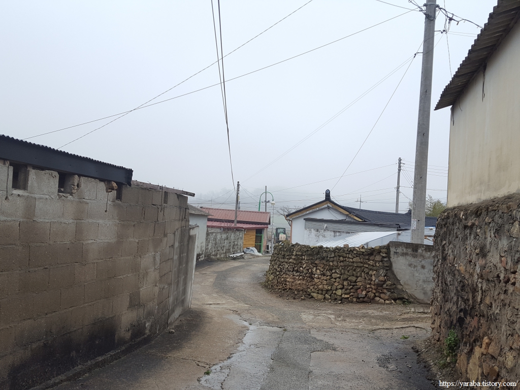 뒤돌아서 신사마을 쪽으로 바라보니 비구름은 산중턱에 걸려있고, 가끔씩 보슬비가 내리는 가운데 차분한 분위기가 가득하다. 선비가 새롭게 이룬 마을이라고 신사마을이라 불렀다고 한다.