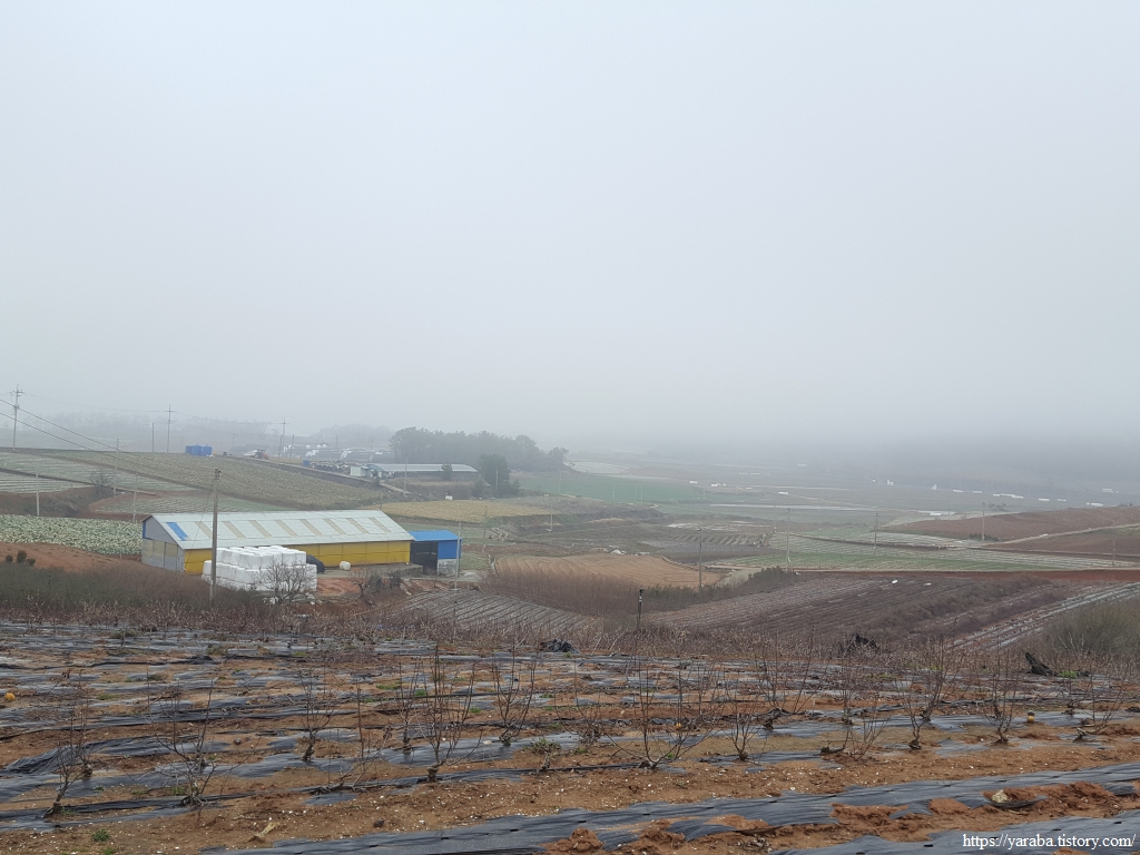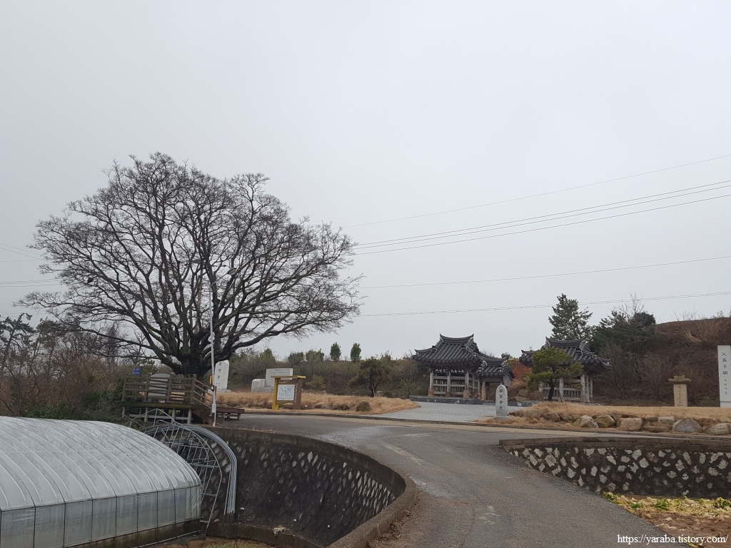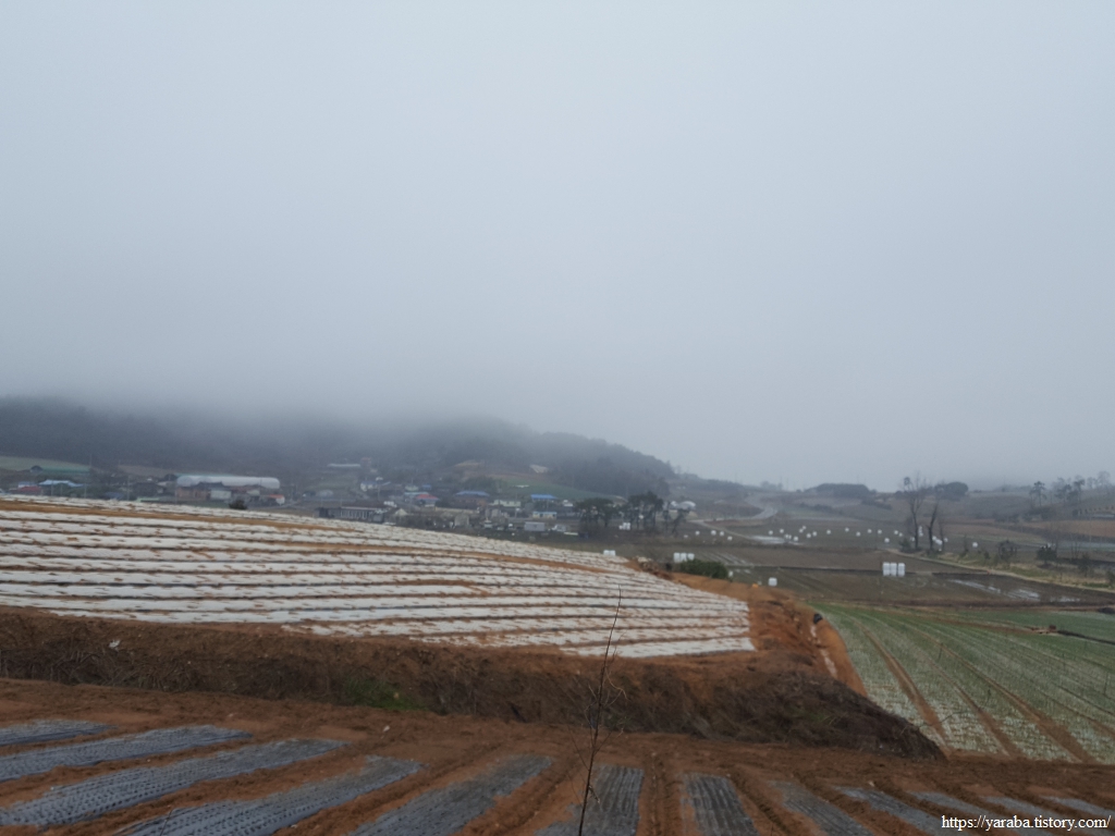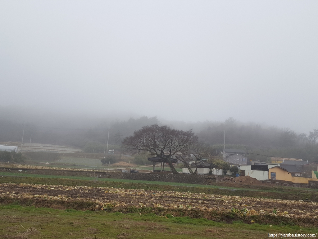 뒤돌아서 신사마을 쪽으로 바라보니 비구름은 산중턱에 걸려있고, 가끔씩 보슬비가 내리는 가운데 차분한 분위기가 가득하다. 선비가 새롭게 이룬 마을이라고 신사마을이라 불렀다고 한다.
