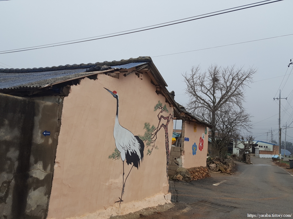 집은 낡았지만 벽면을 장식한 한 마리 학과 소나무가 작품 한 채를 만들었다.