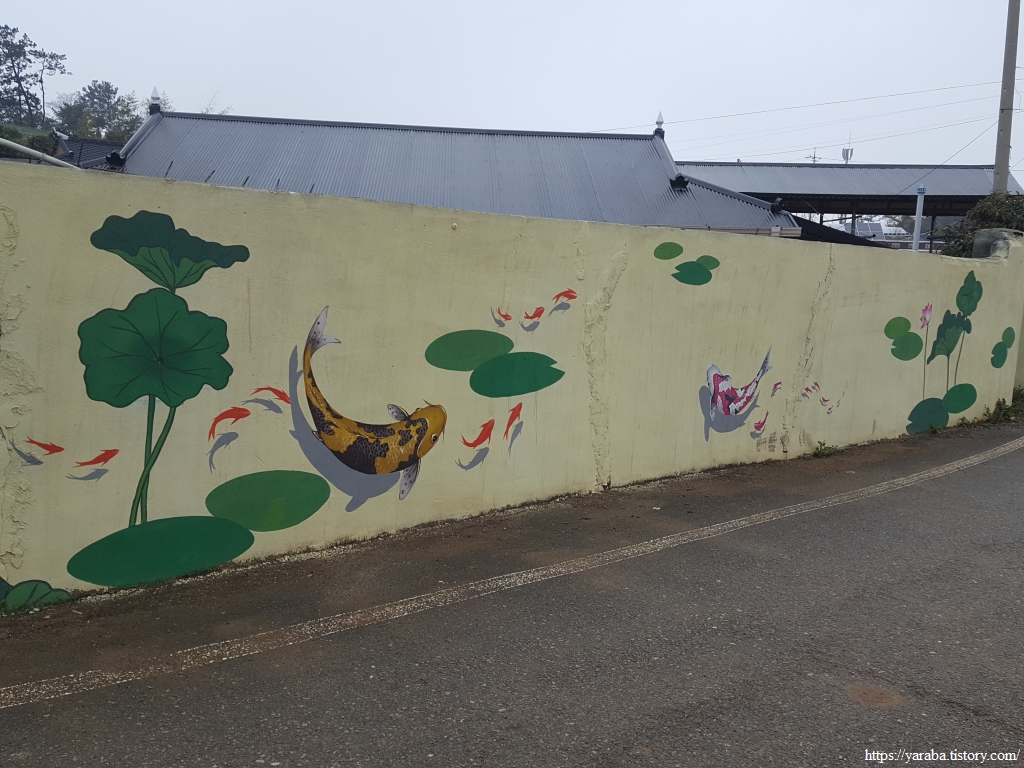 이번 벽화는 연꽃 아래서 노니는 잉어 그림이다. 화려하진 않아도 평화로운 분위기를 선사하기에 충분하다.