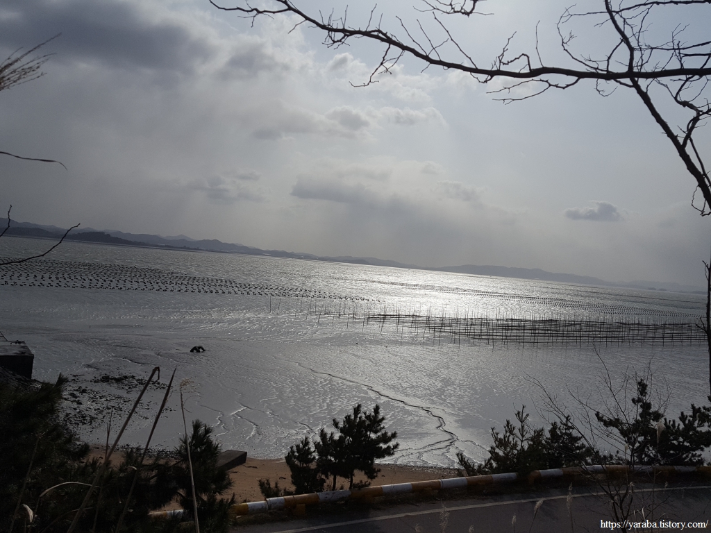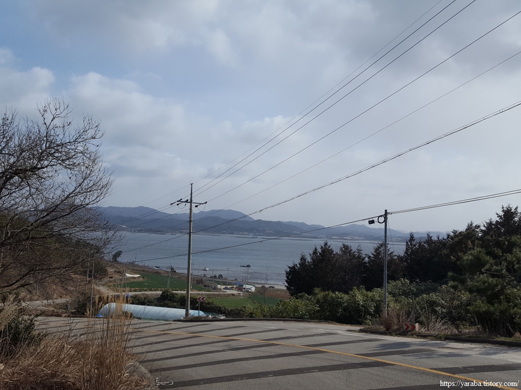 송계산으로 향하는 길, 언덕길을 조금 오르니 도리포 앞바다의 김양식이 은빛 바다로 시야에 들어온다. 이곳은 지주식 김양식과 부유식 김양식을 함께하는 모양이다.