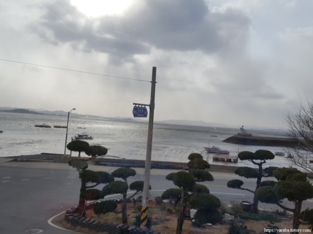 해제면 끝자락 도리포에 도착하니 세찬 바람과 함께 진눈깨비가 날리기 시작한다. 스틱을 잡은 손도 꽁꽁 얼었지만 이른 시간부터 바람을 계속 맞다 보니 온몸이 얼음이다. 오전 9시가 조금 넘는 시각이라 포구 앞 카페가 이제 막 장사를 준비하고 있었는데 양해를 구하고 따뜻한 커피와 함께 잠시 몸을 녹이고 여정을 이어가기로 했다. 김도 함께 판매하는 곳이었는데 커피와 함께 구운 햇김을 맛보기로 주셨다.