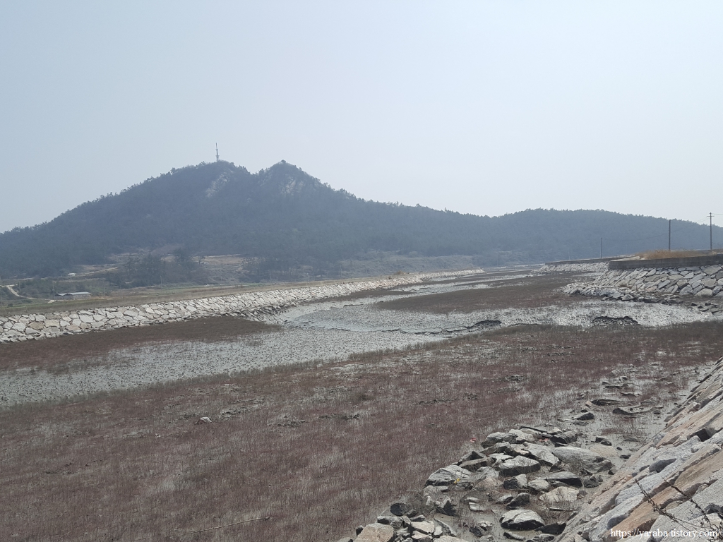 해안 제방길을 따라 서쪽으로 걷는 길, 남쪽으로는 갯벌이 얼마나 큰지 바닷물은 보이지 않고 갯벌이 지평선인 것 같다. 북쪽으로는 가음산 전경이 한눈에 들어온다.