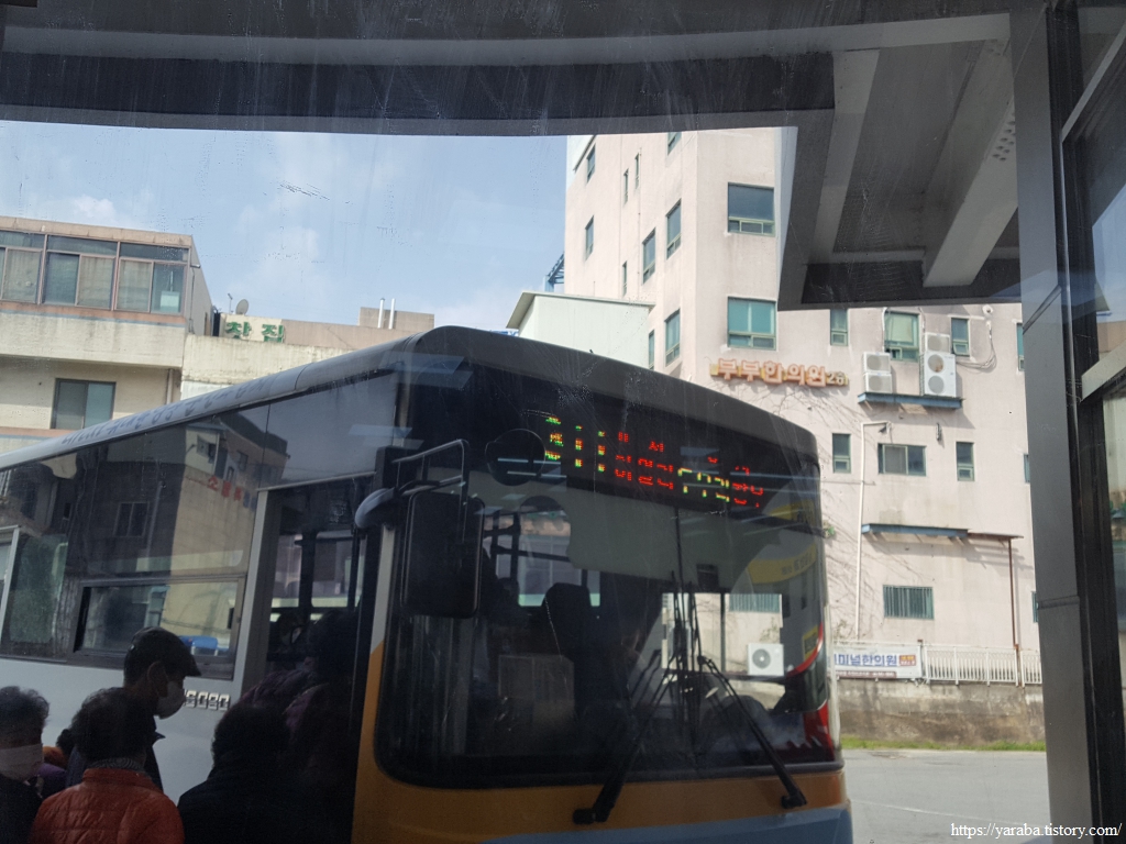 3월 말의 주말 아침 두우리로 향하는 영광 농어촌 버스는 사람들로 북적인다. 37코스의 시작점인 합산마을로 가려면 두우리로 가는 버스를 타고 양일마을에 내려서 1Km 정도 들어가면 된다. 물론 시간을 잘 맞추면 합산마을을 거쳐서 가는 버스를 타고 합산마을에서 내릴 수도 있다.