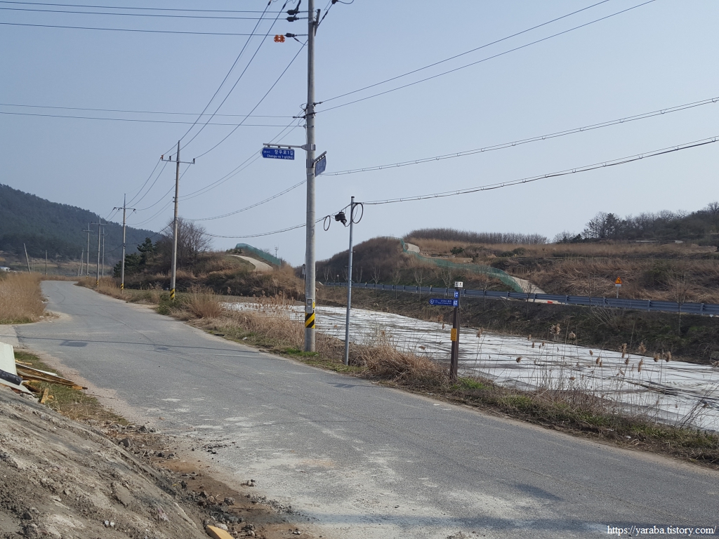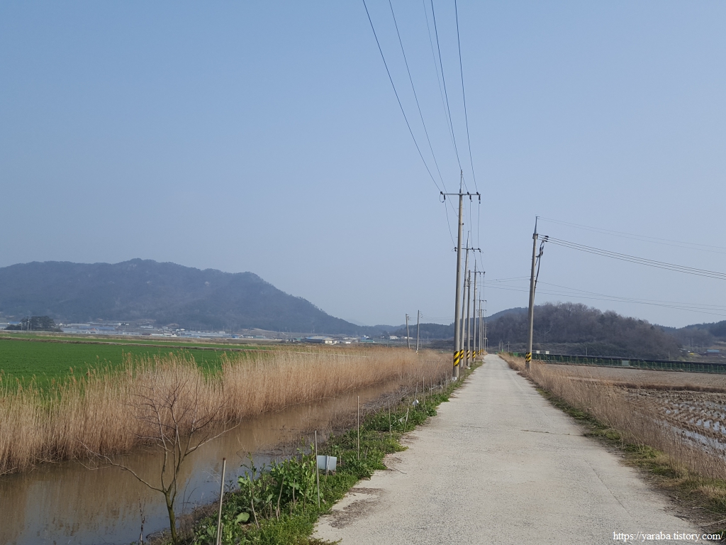 수로를 따라서 남쪽으로 내려가다가 좌회전하여 77번 국도 방향으로 향한다. 농로 양쪽에 있는 청보리밭도 봄기운이 완연하다.