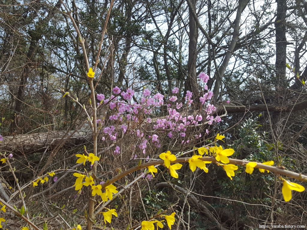 개나리 곁에서는 분홍빛 진달래도 색깔 뽐내기를 사양하지 않는다. 눈과 마음이 호강한다. 서해랑길 걷기 덕분에 봄나들이가 제대로다.