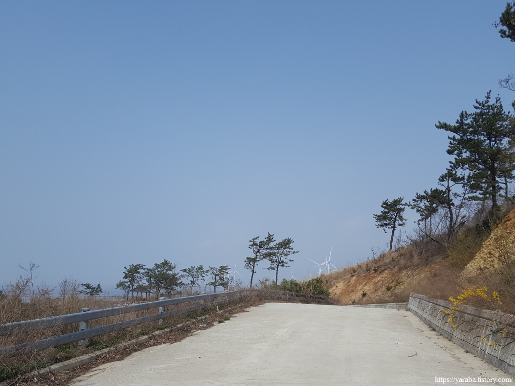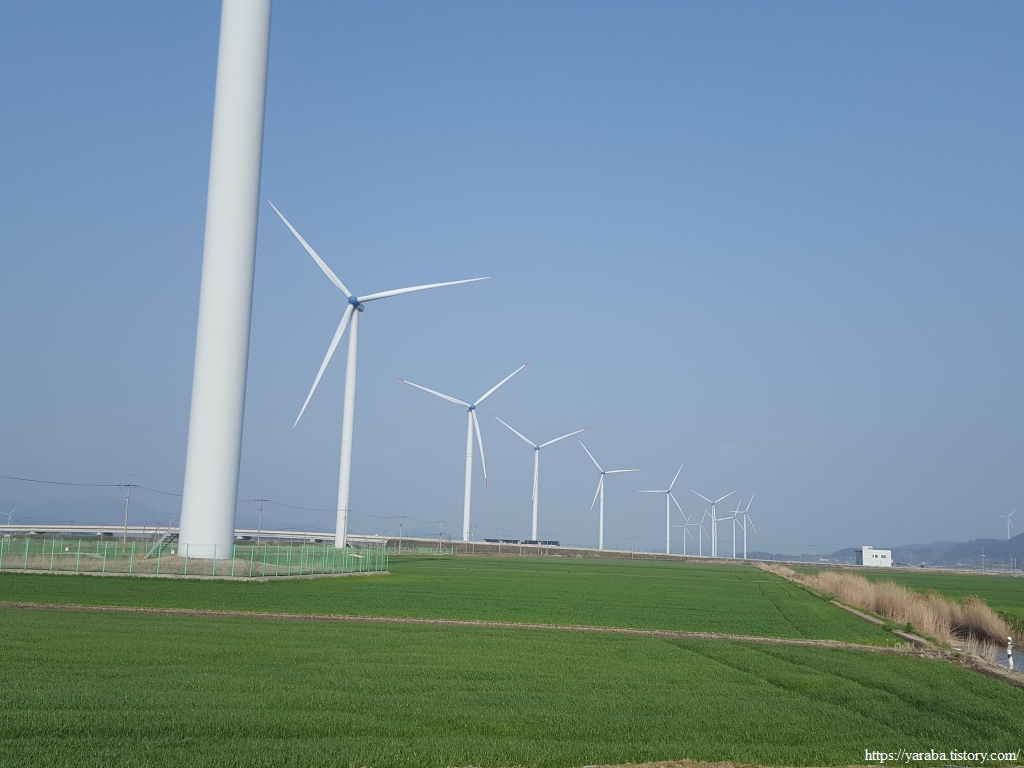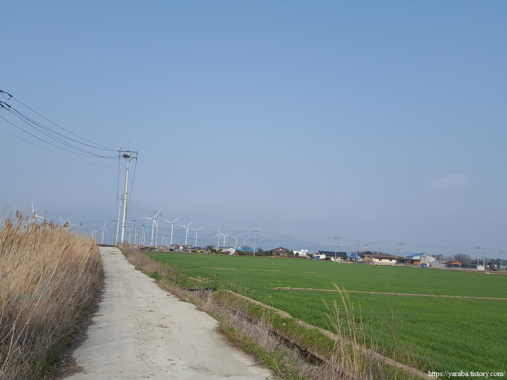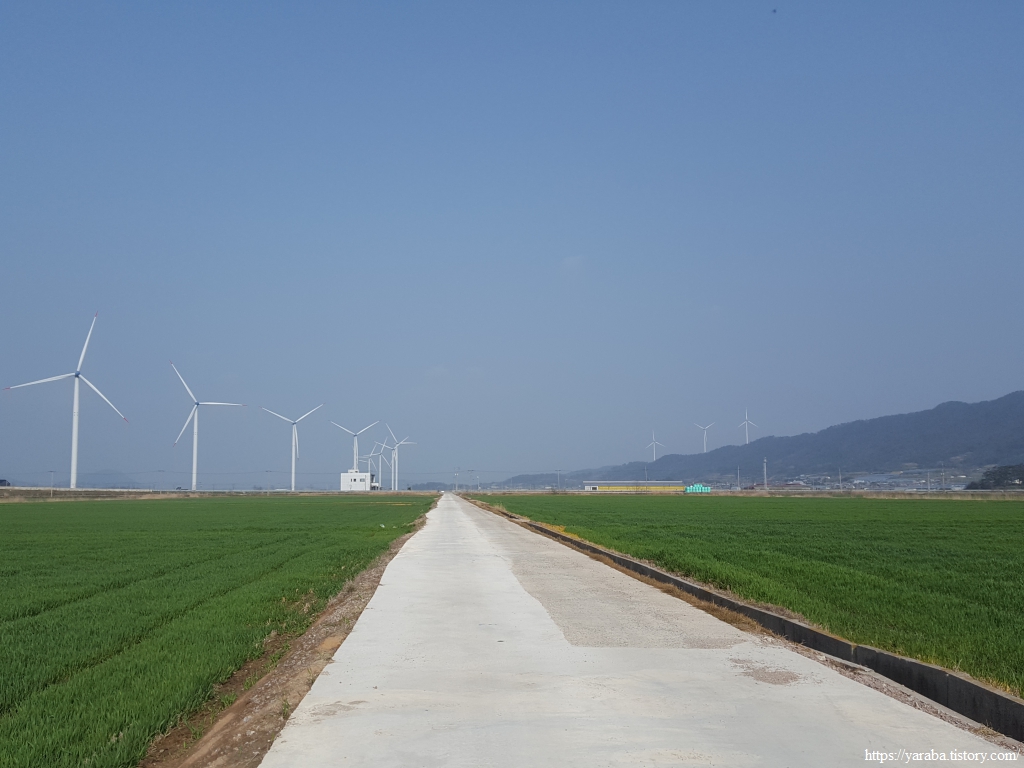 저 멀리 수평선을 바라보면서 언덕길을 돌아가니 드디어 영광 들판을 채우고 있는 풍력발전기들이 보이기 시작한다.