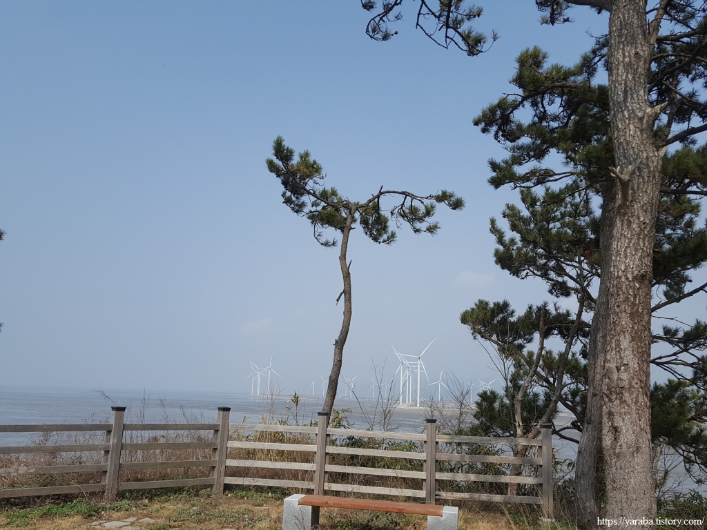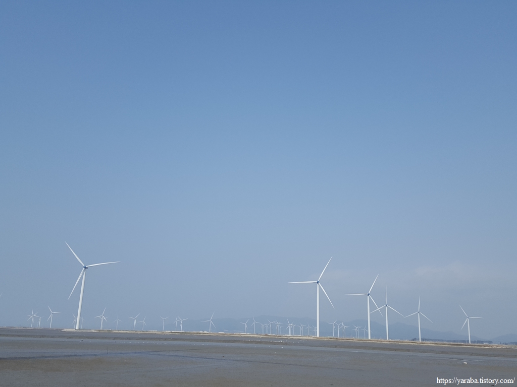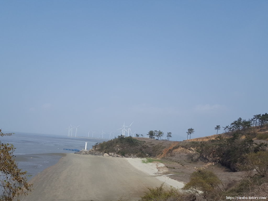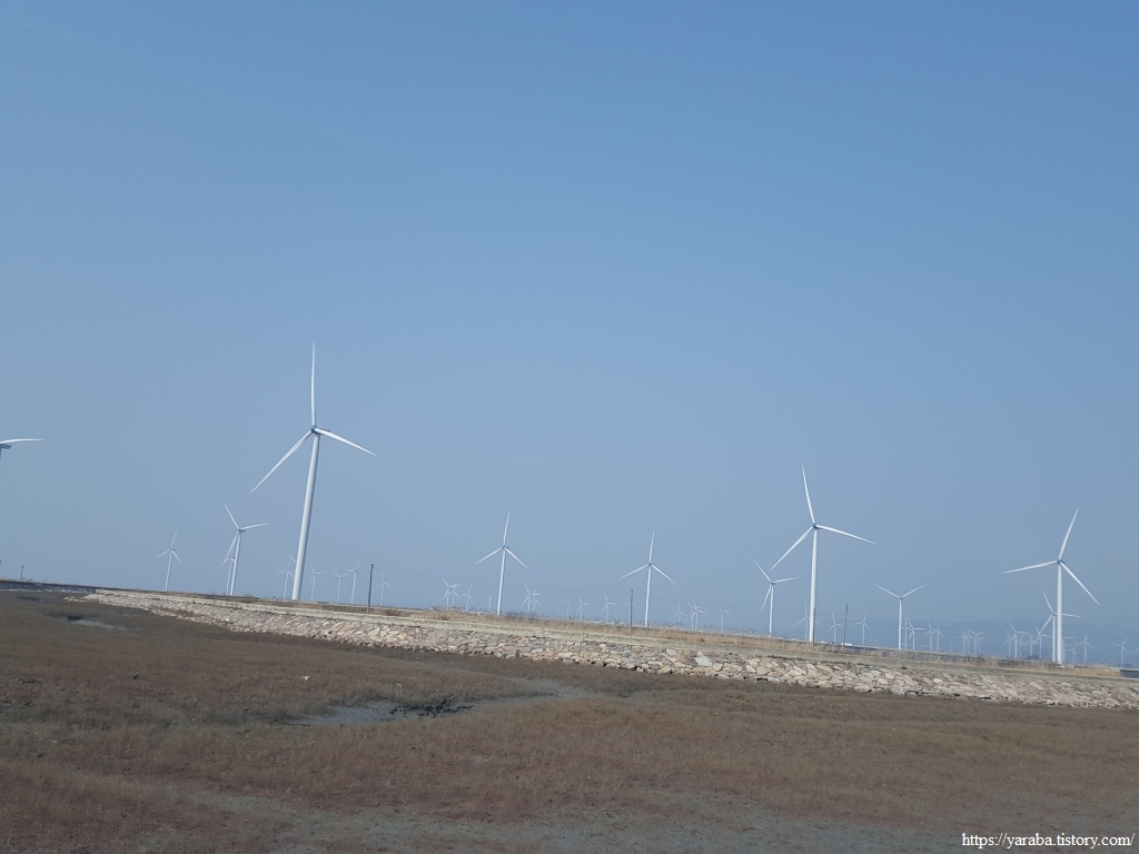 저 멀리 수평선을 바라보면서 언덕길을 돌아가니 드디어 영광 들판을 채우고 있는 풍력발전기들이 보이기 시작한다.