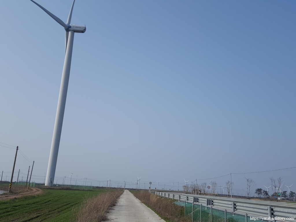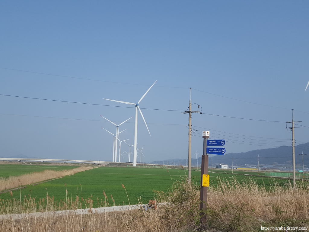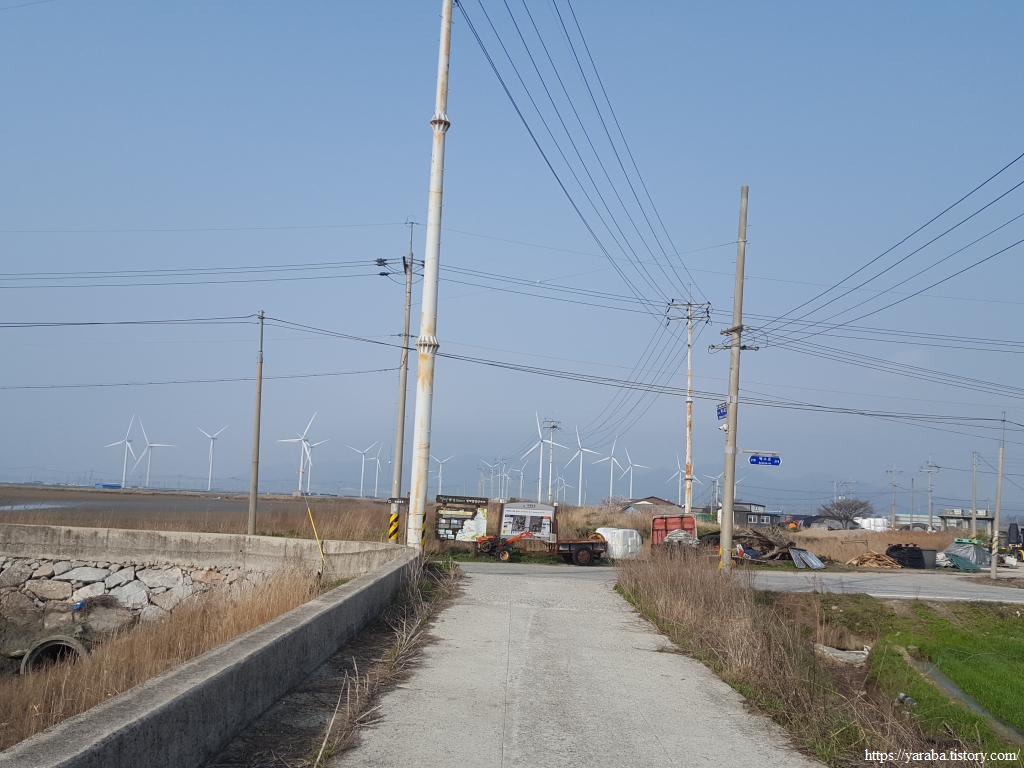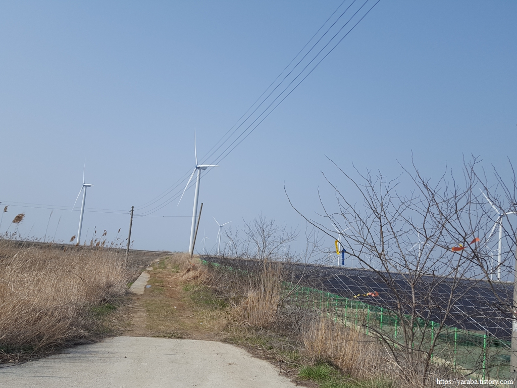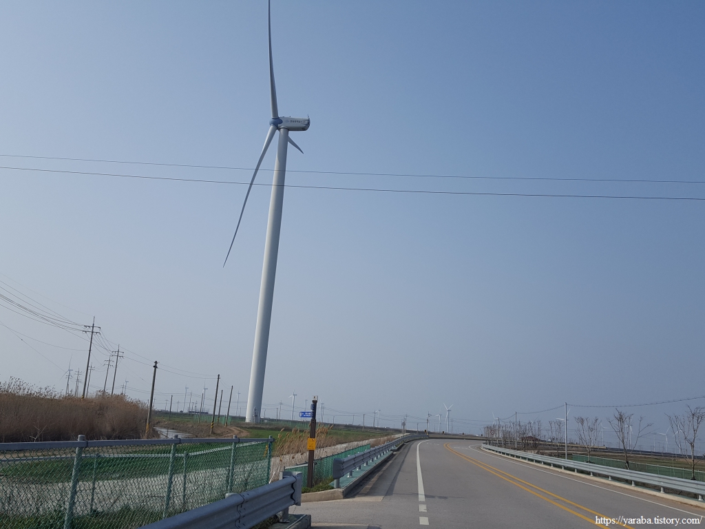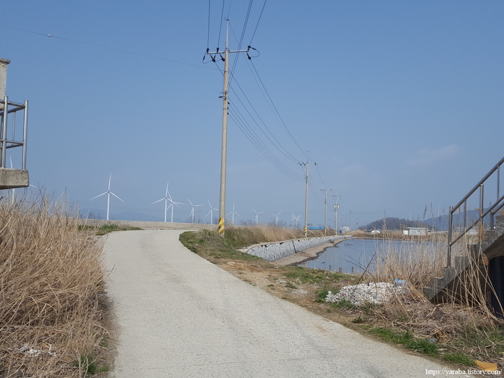 길은 불갑천을 따라 거슬러 올라가는데, 풍력발전기들도 불갑천변에 몇 기가 설치되어 있고 간척지 해안방조제를 따라서도 설치되어 있다. 해안선을 따라 설치된 것은 해상풍력으로 간주하는 모양이다.