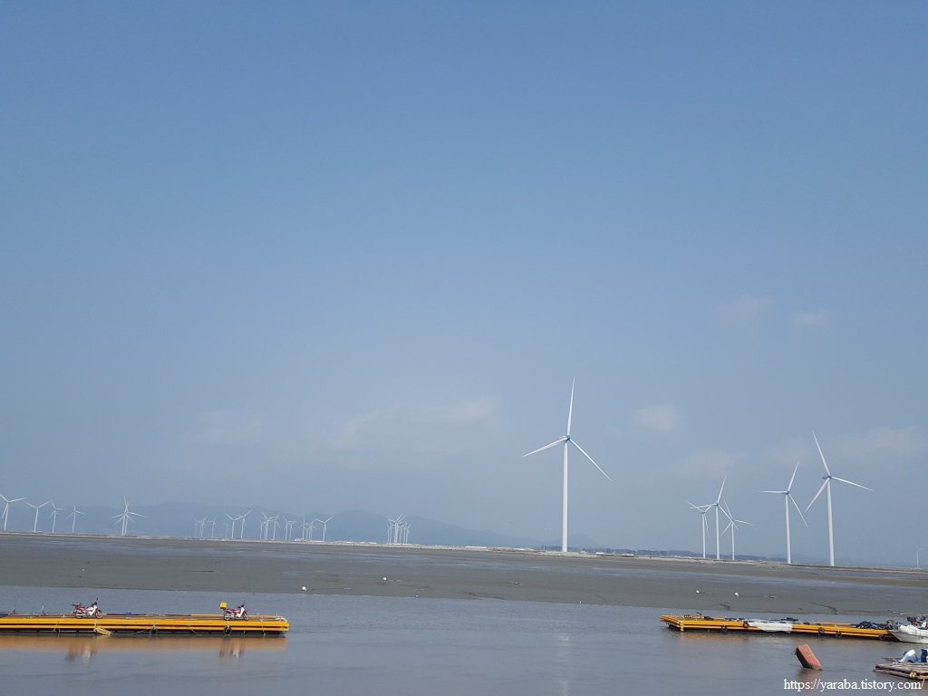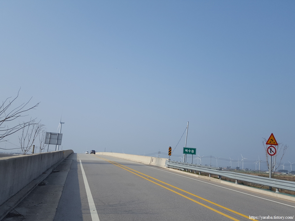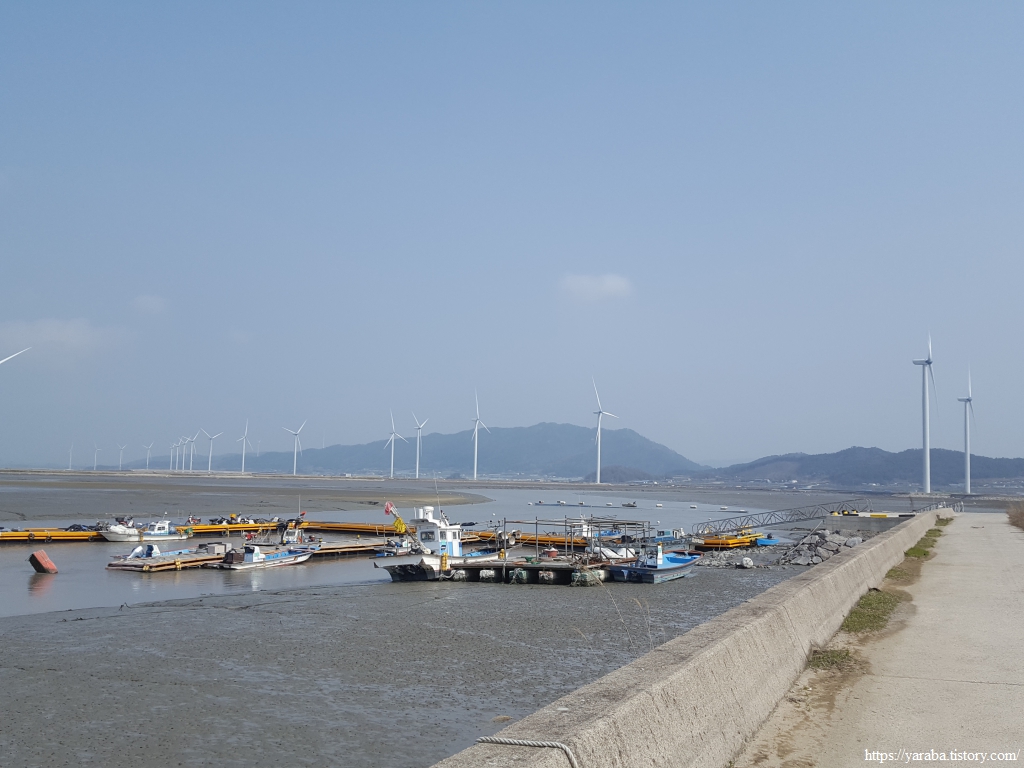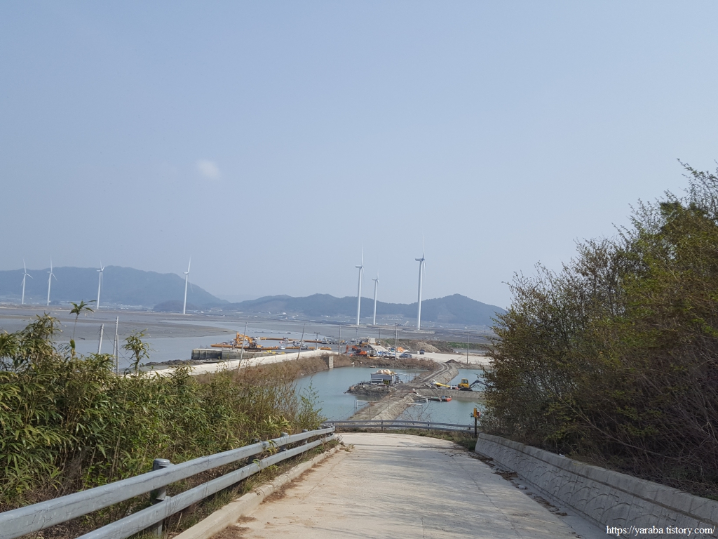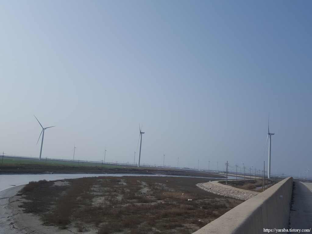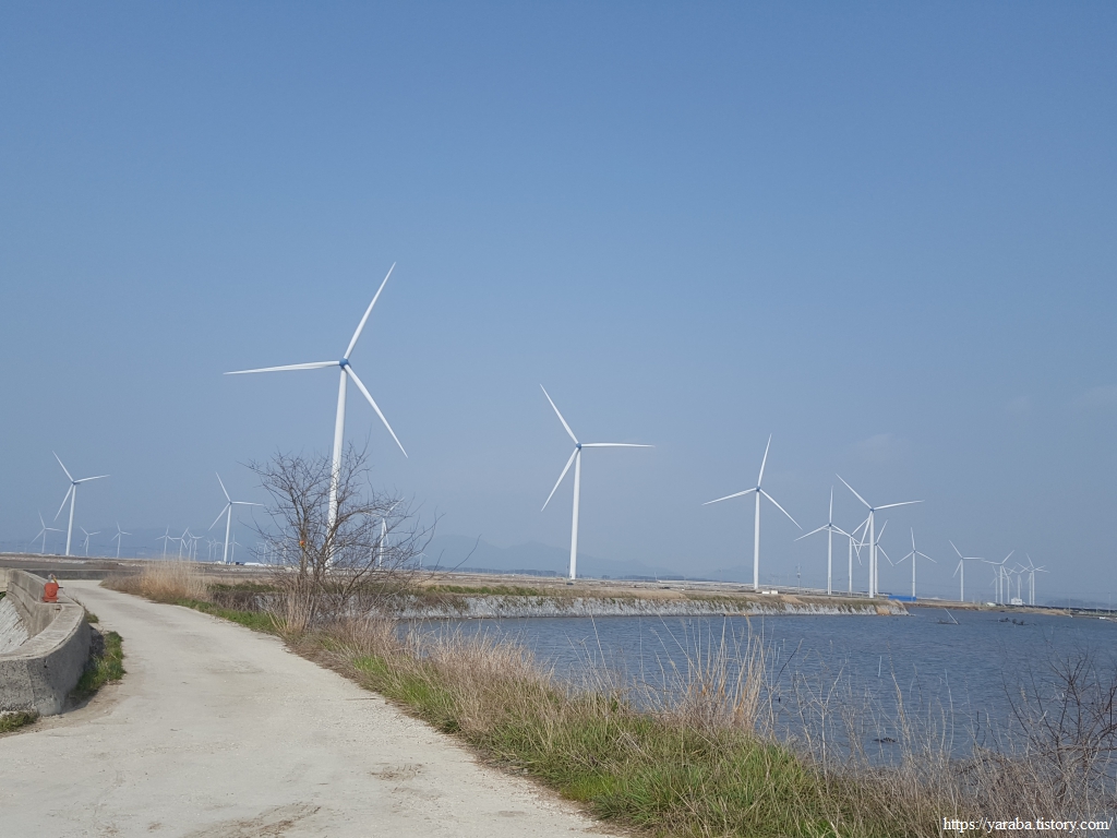 길은 불갑천을 따라 거슬러 올라가는데, 풍력발전기들도 불갑천변에 몇 기가 설치되어 있고 간척지 해안방조제를 따라서도 설치되어 있다. 해안선을 따라 설치된 것은 해상풍력으로 간주하는 모양이다.