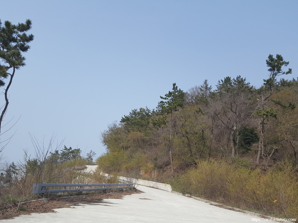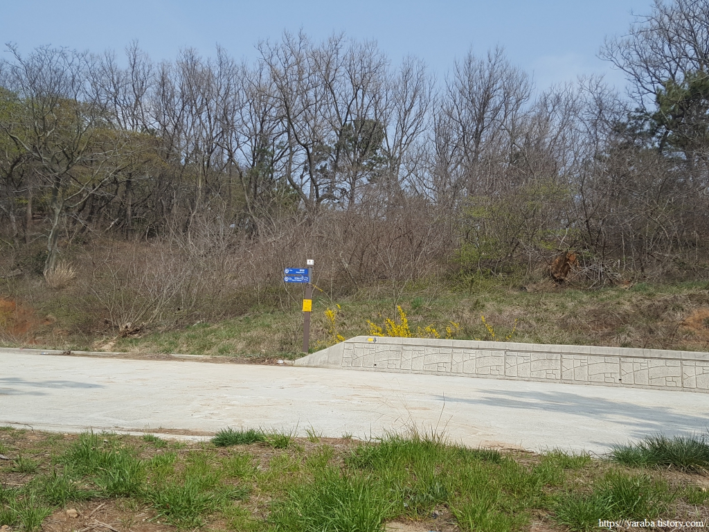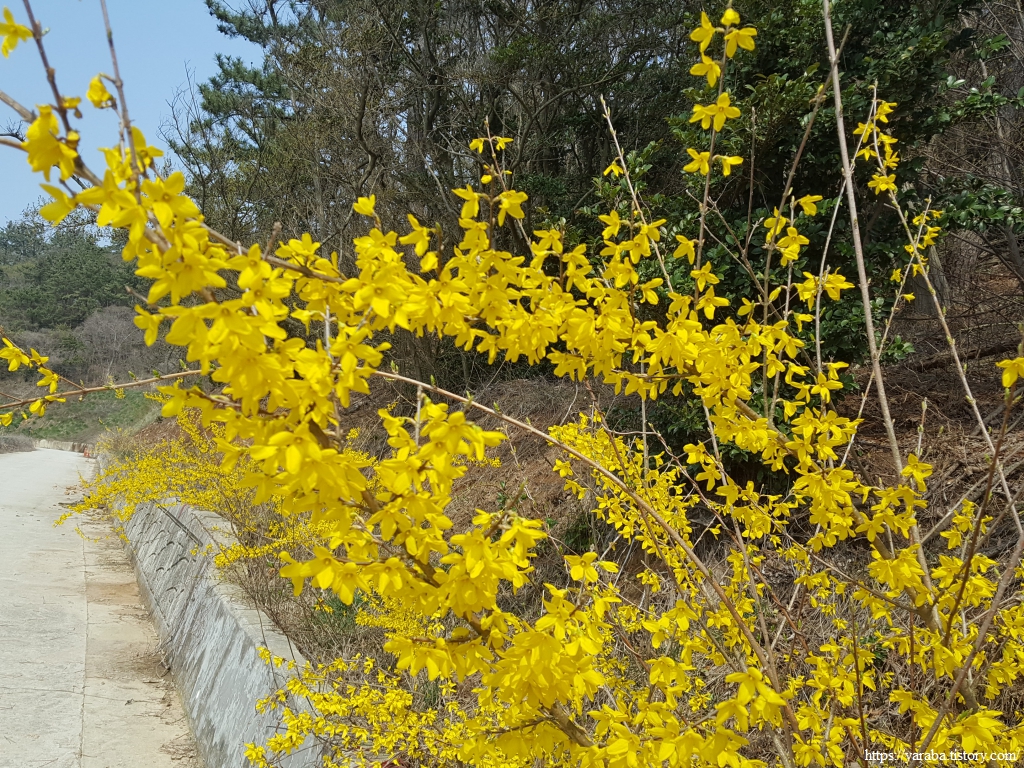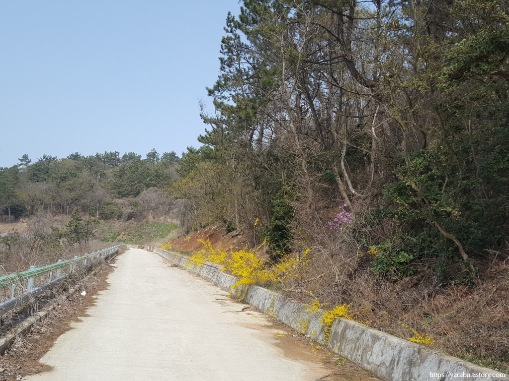 임도는 80여 미터의 작은 산을 돌아가는 멀지 않은 길이다. 이름도 그냥 "뒷산"이다. 이곳은 양달이라 그런지 봄기운이 완연하다. 길 주위로 노란 개나리가 찬란하다.