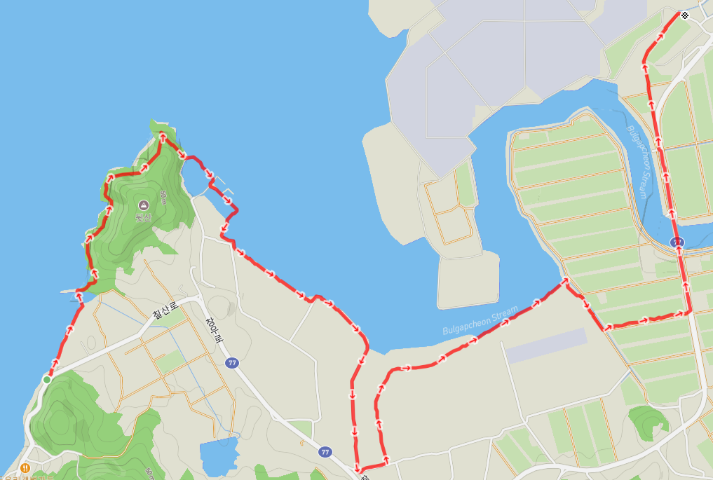 77번 국도와 함께 불갑천을 건너면 국도 옆의 농로를 따라 이동한다.
