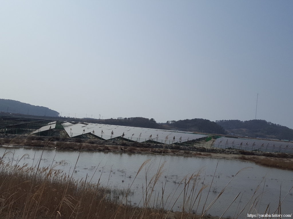 내륙의 불갑산 자락에서 발원하여 30여 km를 흘러내려온 불갑천을 따라 올라간다. 어찌 보면 이곳의 광활한 평야는 사람이 제방을 쌓아 만들기는 했지만 불갑천이 만들어 놓은 것이 아닌가 싶다. 광활한 평야에는 농지뿐만 아니라 대단위 태양광 발전소도 즐비하다. 영광군에서는 RE100을 지원하는 RE100 전용 산업단지를 추진하고 있다고 한다. 풍력과 태양광 등 재생에너지로만 운영하는 산업단지이다. 물론 영광군뿐만 아니라 전국 곳곳에서 비슷한 정책을 추진하고 있는데 나름 의미가 있어 보인다.