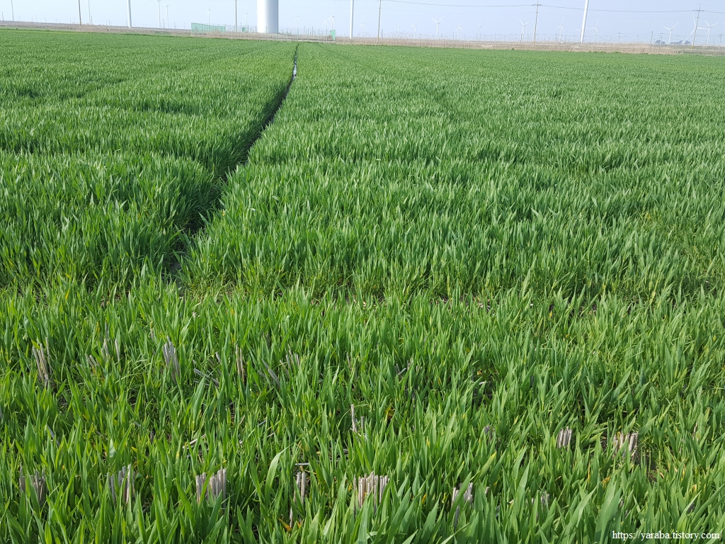 푸른 양탄자, 잘 키운 잔디밭 같은 보리밭 곁에 쭈그리고 앉아 보리의 생생한 기운을 받는다. 생명력이 뿜뿜 한다.