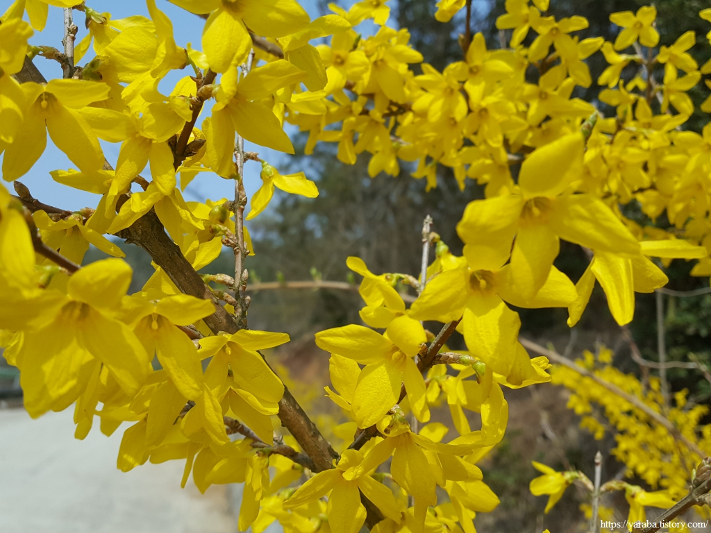개나리의 노란색이 이렇게 찬란했던가! 쾌청한 하늘에서 쏟아지는 햇살의 자연스러운 조명 덕분에 눈이 활짝 떠질 정도로 화사한 색깔이 빛난다.