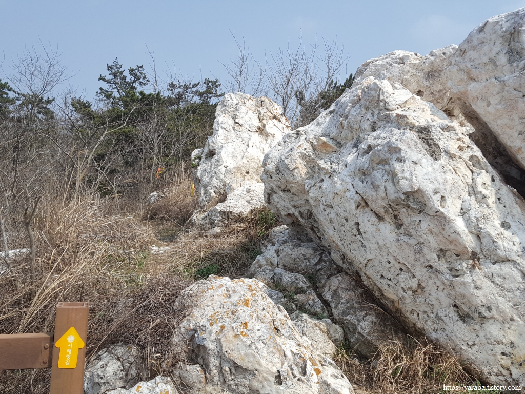 해변을 지나온 길은 암석 지대를 거쳐서 임도로 올라가는데, 하얀 바위를 보니 진짜 괜히 "백바위"라는 별명이 붙은 것이 아니구나 하는 생각이 들었다.