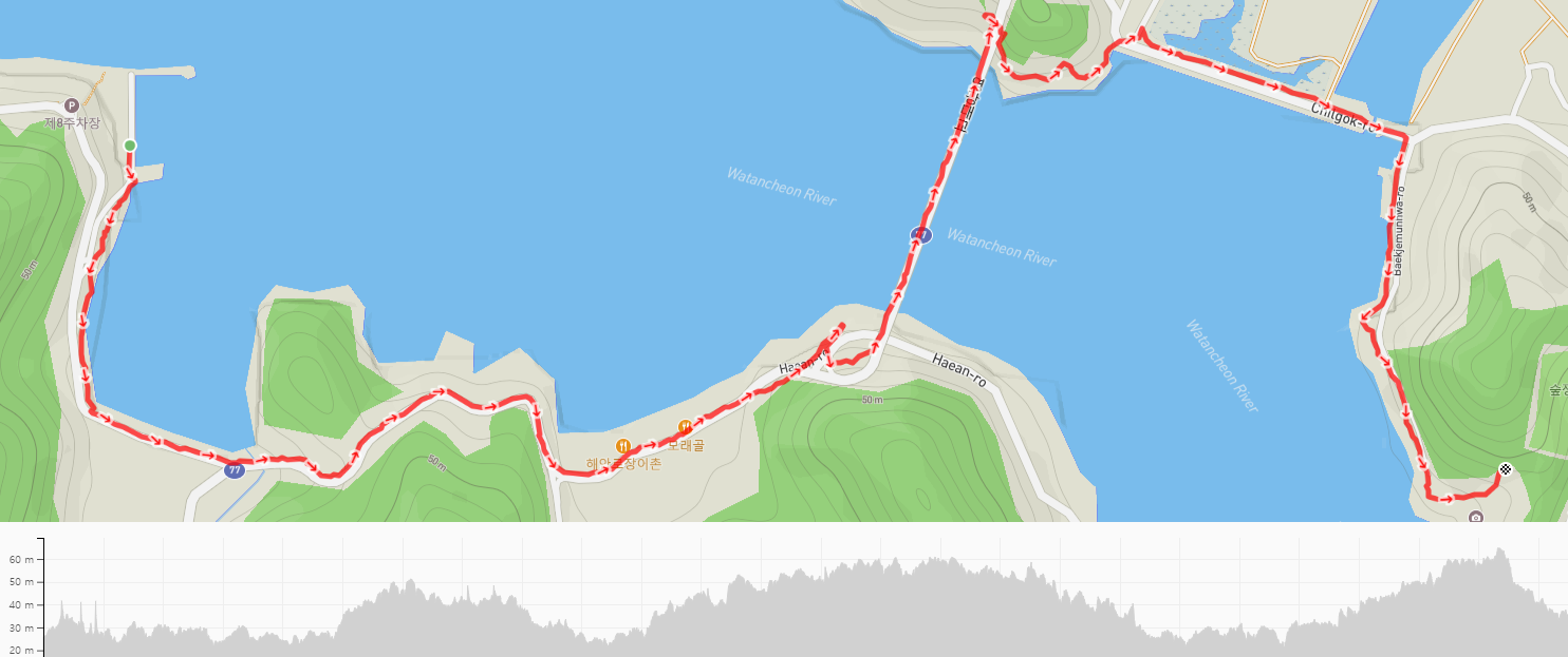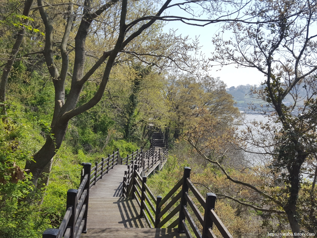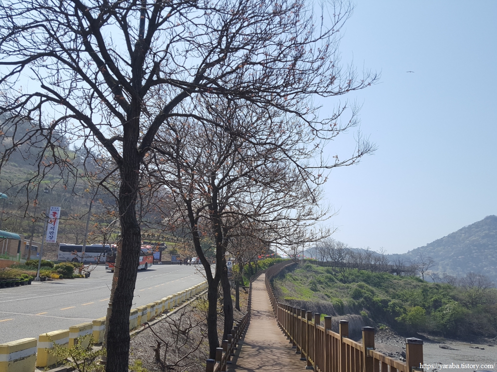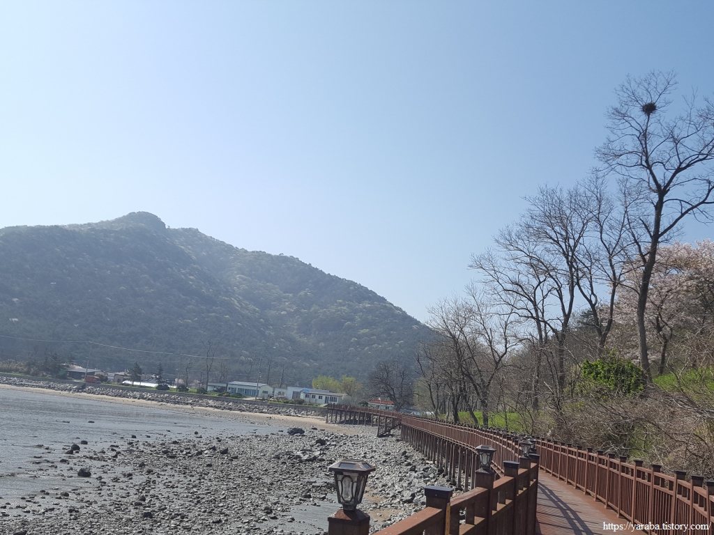 와탄천 건너편의 구수산 자락의 해안도로를 따라 이어지는 벚꽃길도 일품이다. 벚꽃길을 가까이에서 보아도 좋고 멀리서 보아도 일품이다. 해안선을 따라서 이어지는 숲 속 데크길은 마치 원시림을 통과하는 느낌이다.