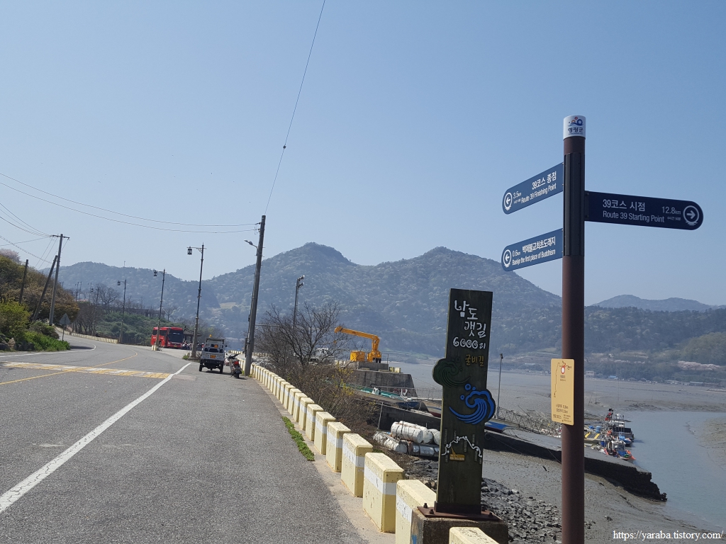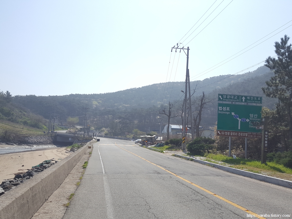 데크길을 지나서 대초마을 앞에서 해안도로와 합류하여 영광대교까지는 도로를 따라서 길을 이어간다. 39코스의 종점인 법성포 길 표지가 등장했다.