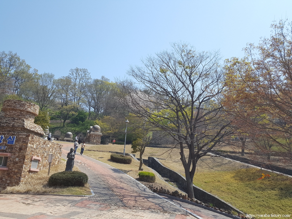 백제불교최초도래지에서 마라난타사 사찰을 지나 승강기를 타면 바로 법성포로 갈 수도 있지만 서해랑길은 전시관 앞을 지나 언덕을 올라서 공원 방향으로 이동한다.