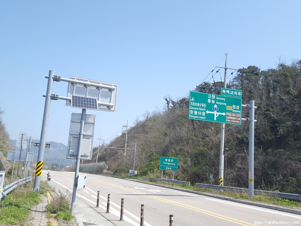 영광대교를 넘어서 홍농읍으로 들어온 길은 좌측으로 길을 돌아서 도로 아래의 굴다리를 통과해야 한다.