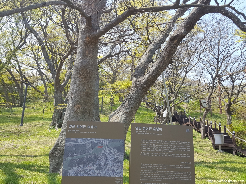 입구에 있는 안내문을 읽어보니 숲쟁이라는 이름과 숲의 배경에 대해서 알 수 있었다. "쟁이"가 성이라 의미이니 숲으로 된 성이란 의미이다. 이곳은 법성진을 보호하기 위해 조성한 인공숲으로 그 옛날 조성한 숲의 혜택을 후대가 누린다. 후대를 위한다면 역시 나무를 계속 심어야 한다.