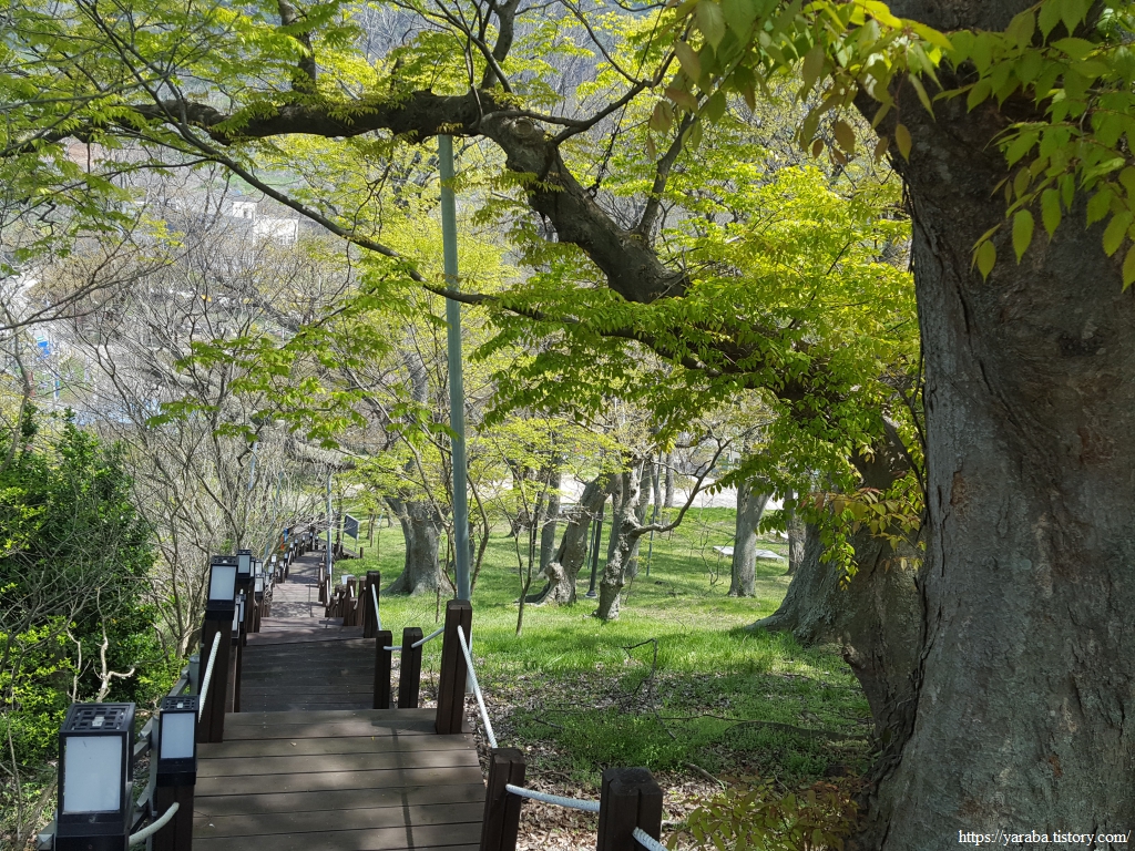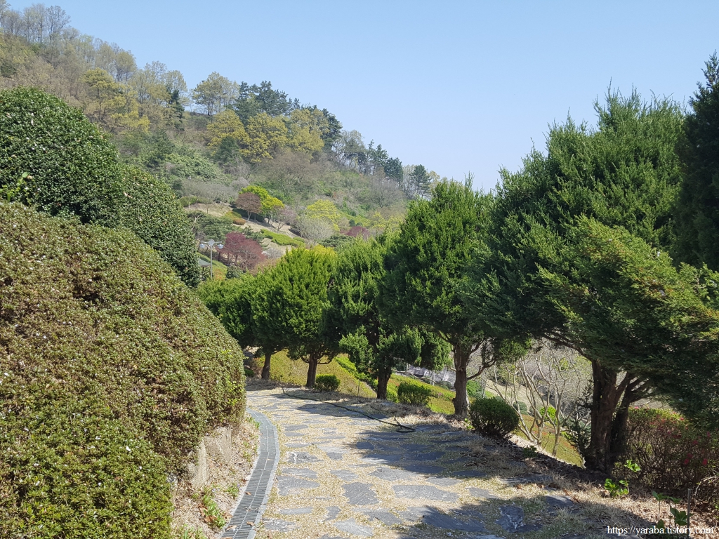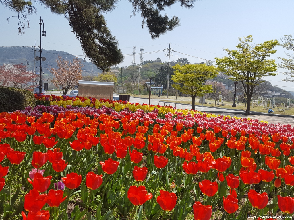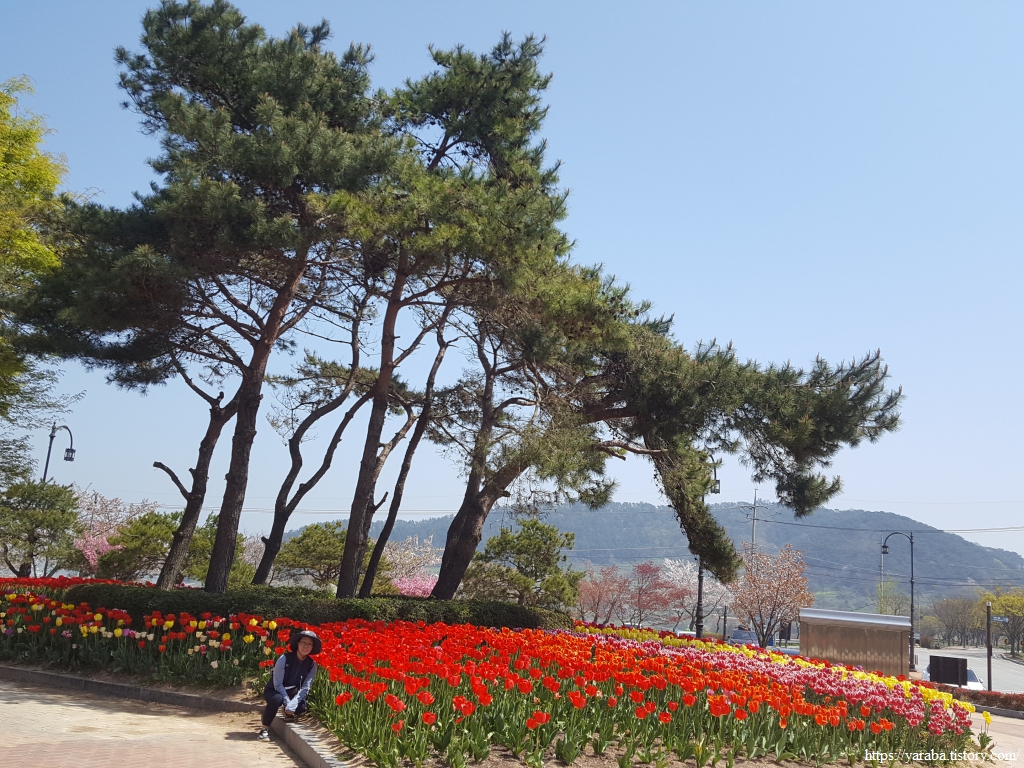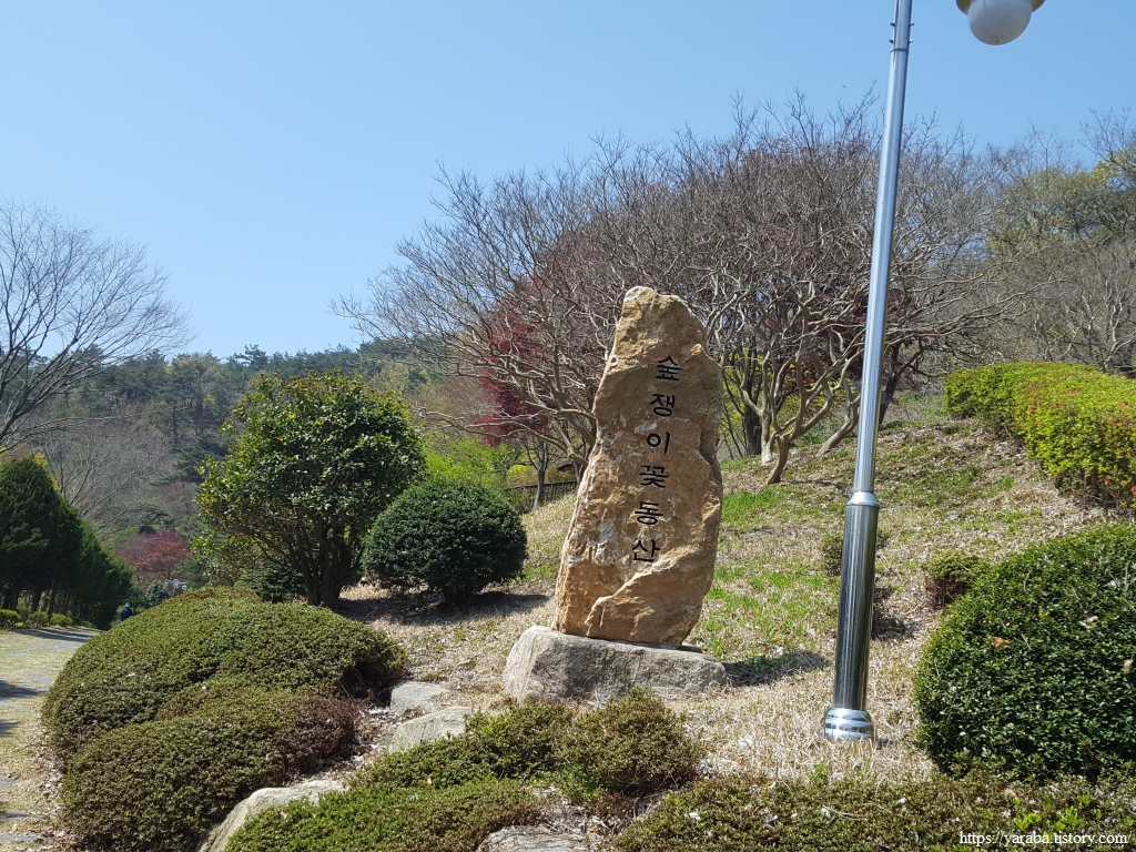 이곳에 자리한 공원의 이름은 숲쟁이꽃동산으로 공원 입구에는 넉넉한 쉼터와 화장실, 주차장도 마련되어 있었다. 화려한 튤립들이 봄을 더욱 빛나게 만들어 주고 있다. 공원 평상에 앉아서 잠시 쉬어간다.