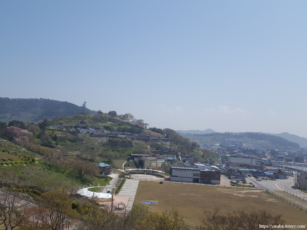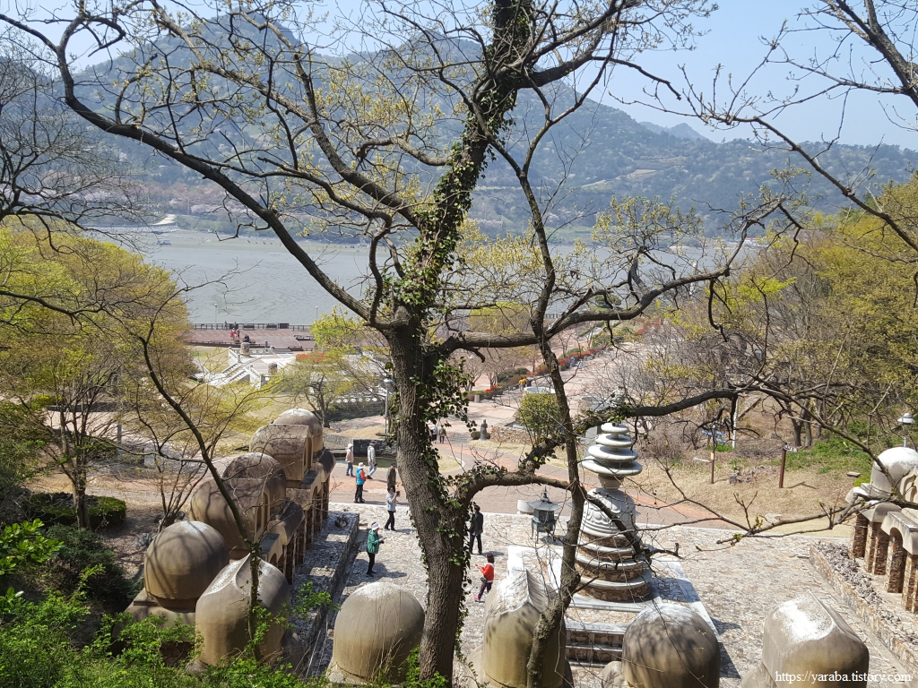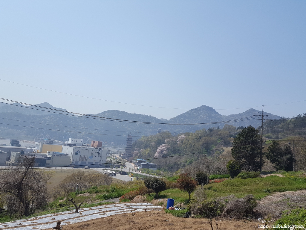 백제불교최초도래지 뒷산으로 오르니 산 아래로 탑원에서 인증 사진 남기기에 여념이 없는 관광객들이 내려다 보인다.