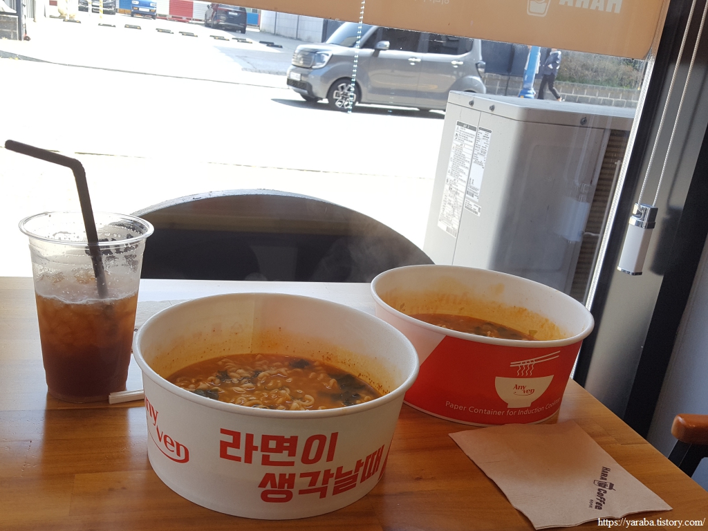 인공섬을 한 바퀴 돌아가는 길에서 만난 무인 라면 가게에서 가볍게 점심을 해결하고 냉커피를 마시면 잠시 휴식을 취하고 코스를 마무리한다. 일회용 용기라 조금 아깝고 쓰레기가 많이 생긴다는 점이 아쉽기는 하지만 무인점포에서 직접 결제하고 라면도 직접 끓여 먹으니 세상은 계속 변해가고 있음이 실감 난다.