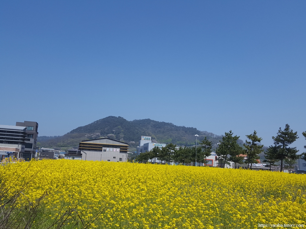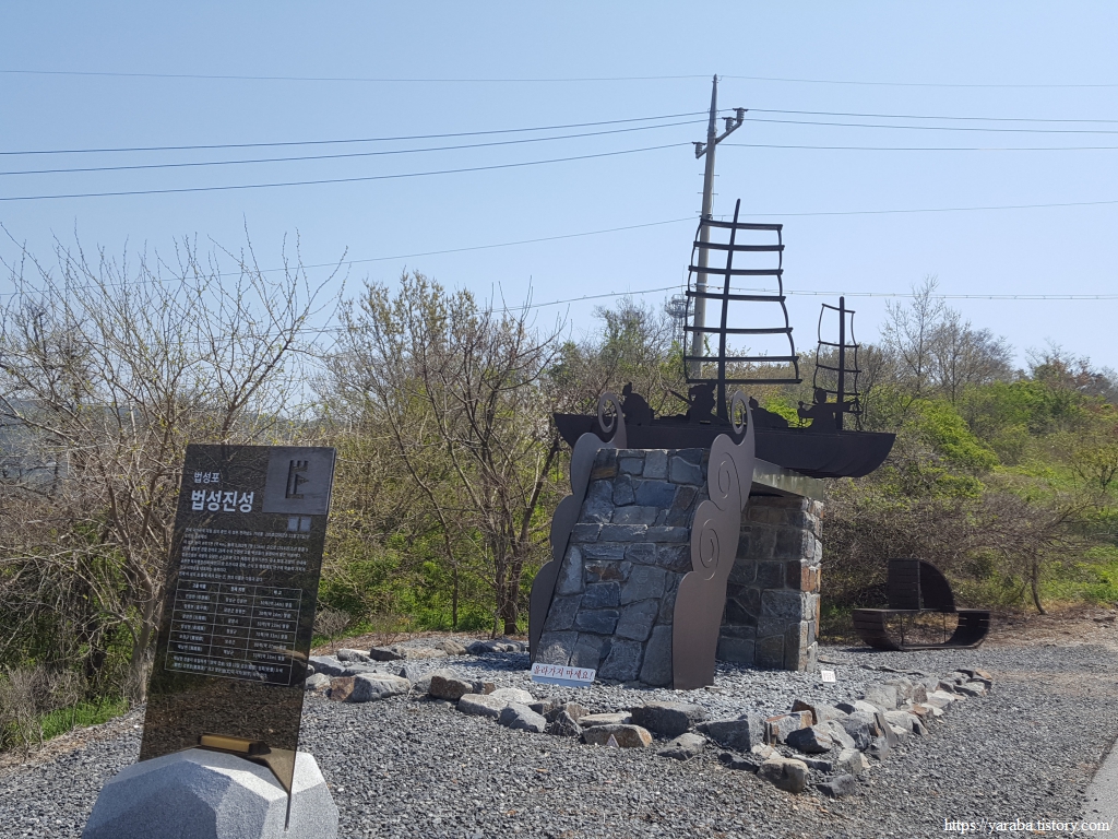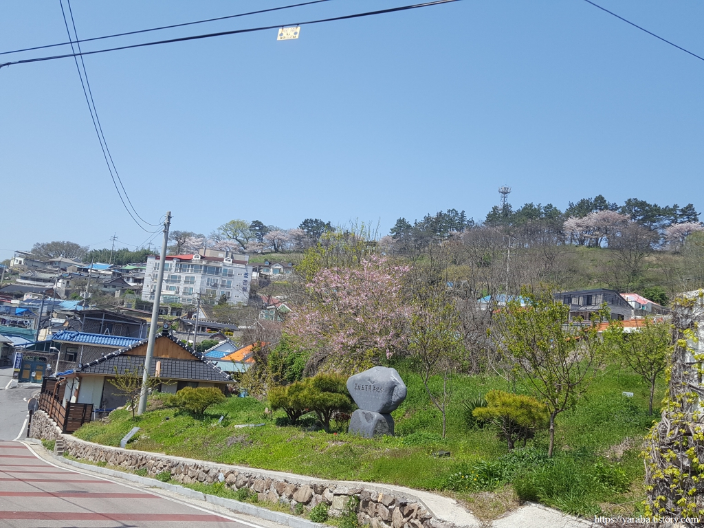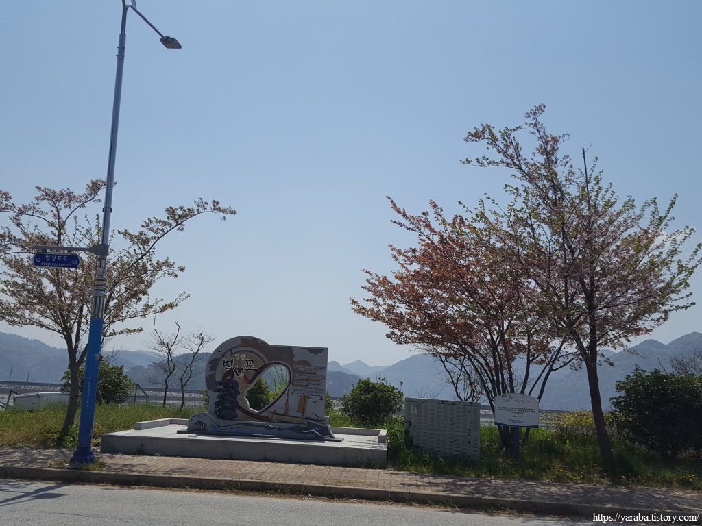인공섬 남쪽 끝자락을 걸으며 만난 유채꽃 뒤로는 법성리의 인의산이 자리하고 있다. 재미있는 것은 이 동네 건물 옥상에는 대부분 지붕이 있는 건조장을 만들어 놓은 모습이었다. 전통적인 굴비 제조법은 섶간이라 하여 조기 아가미에 천임염으로 염장하여 몇 달간 자연 건조하는 것이지만, 요즘은 좋은 장비들을 활용하여 하루정도만 말리고 냉동 보관하는 경우도 있다고 한다. 문외한인 일반인이 분간할 수 있을까 싶다. 법성포 포구의 모습은 포구 조형물이 대신하고 있는 것 아닌가 싶다.