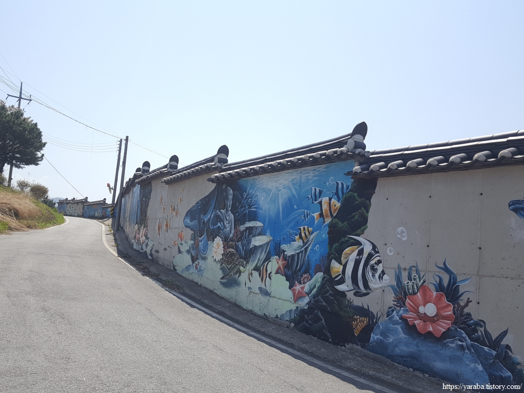 길은 법성진성길로 들어선다. 법성진성은 조선 중종 당시 높이 4미터 길이 1.5km의 규모로 쌓은 성으로 길은 성곽을 따라 이어진 능선길을 걷는다. 벽화를 그려 넣은 담장 너머로는 한옥 펜션 단지가 위치하고 있다.