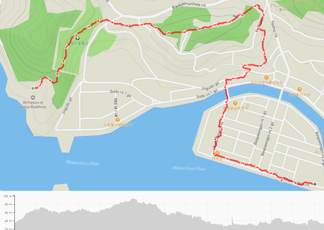 백제불교도래지에 이른 길은 산 능선을 넘으면서 숲쟁이꽃동산과 법성진성을 차례로 지나고 법성면 읍내로 내려간다. 수많은 굴비 가게를 가로질러 읍내 앞의 신시가지로 넘어가서 법성버스정류장 앞에서 코스를 마무리한다.