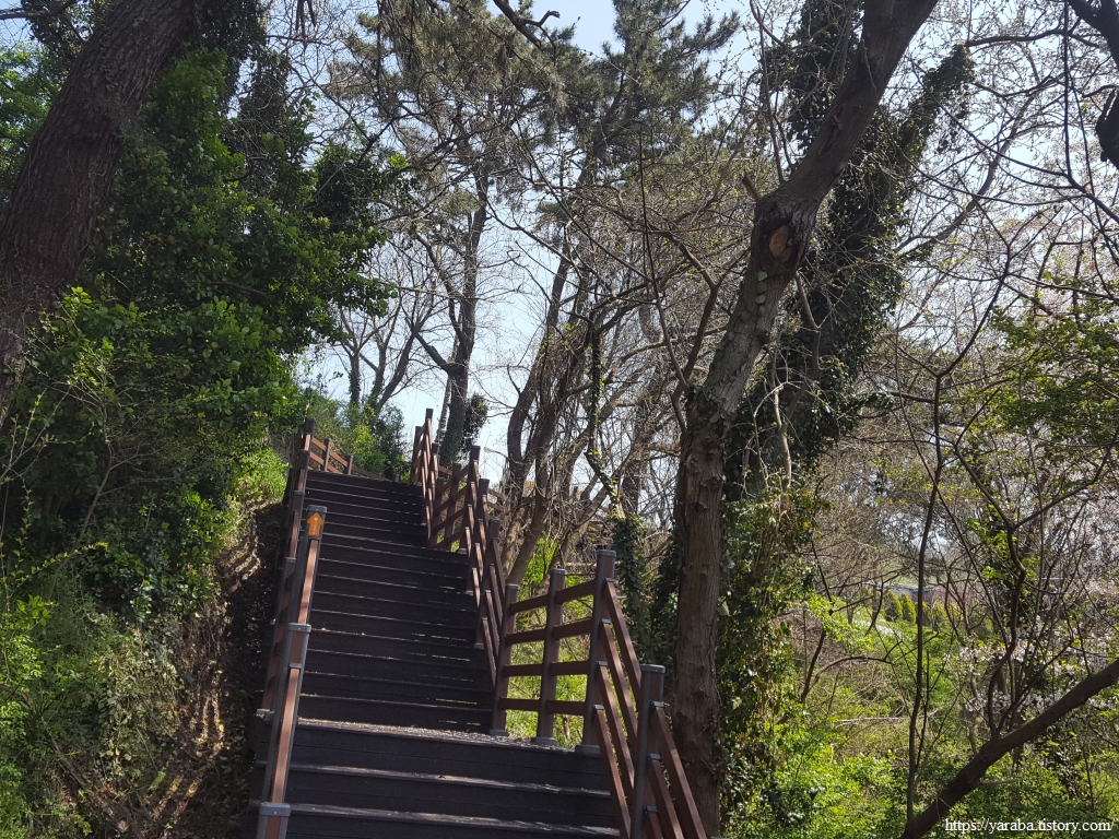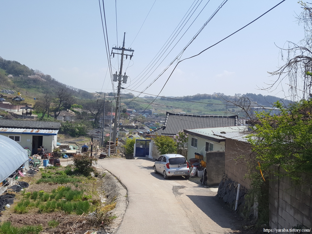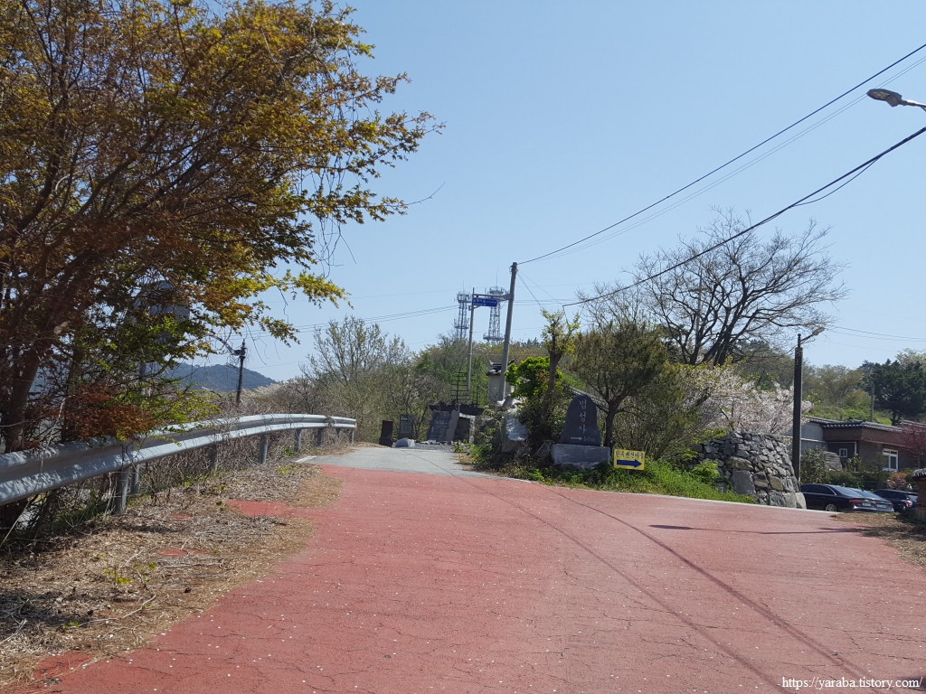 산 위로 올라온 길은 공원을 가로지르는 산책로를 따라 길을 이어간다. 산아래로 법성포 시내도 보이고 건너편 산 위에 자리한 한옥 펜션 단지도 보이는데 서해랑길은 한옥 펜션 뒤편의 산 능선길로 진행한다.