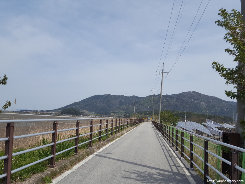 갯벌과 양식장을 보면서 걷는 해안길은 걷기 좋게 잘 다듬어져 있었다. 동쪽으로 향하는 길, 정면에서 경수산(445m)이 우리를 맞아준다.