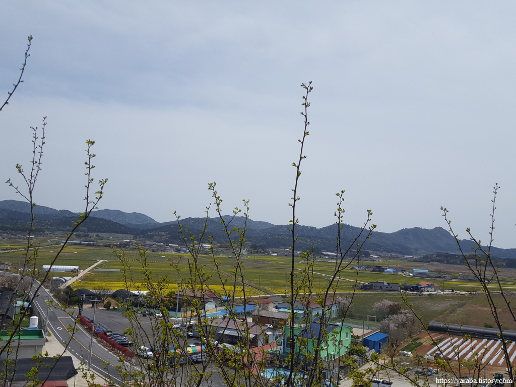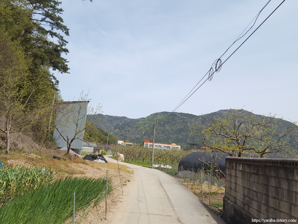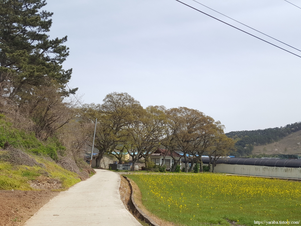 계명산에서 들판을 바라보니 추수 때도 아닌데 평야가 노릇노릇한 색깔이 많다. 경관 농업의 일환이자 녹비작물로 유채를 많이 심고 있음을 눈으로 확인할 수 있었다. 산을 내려가면 만날 계명마을 풍경이다.