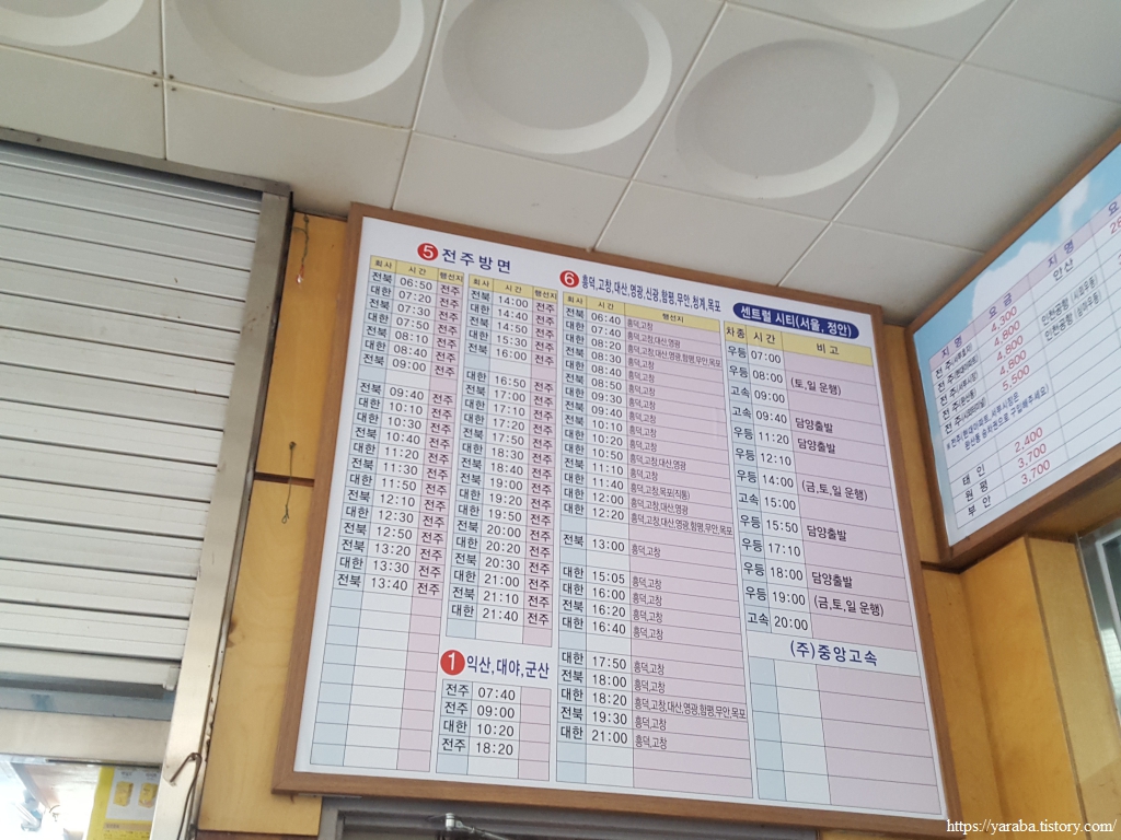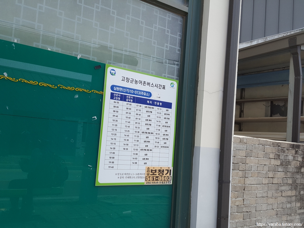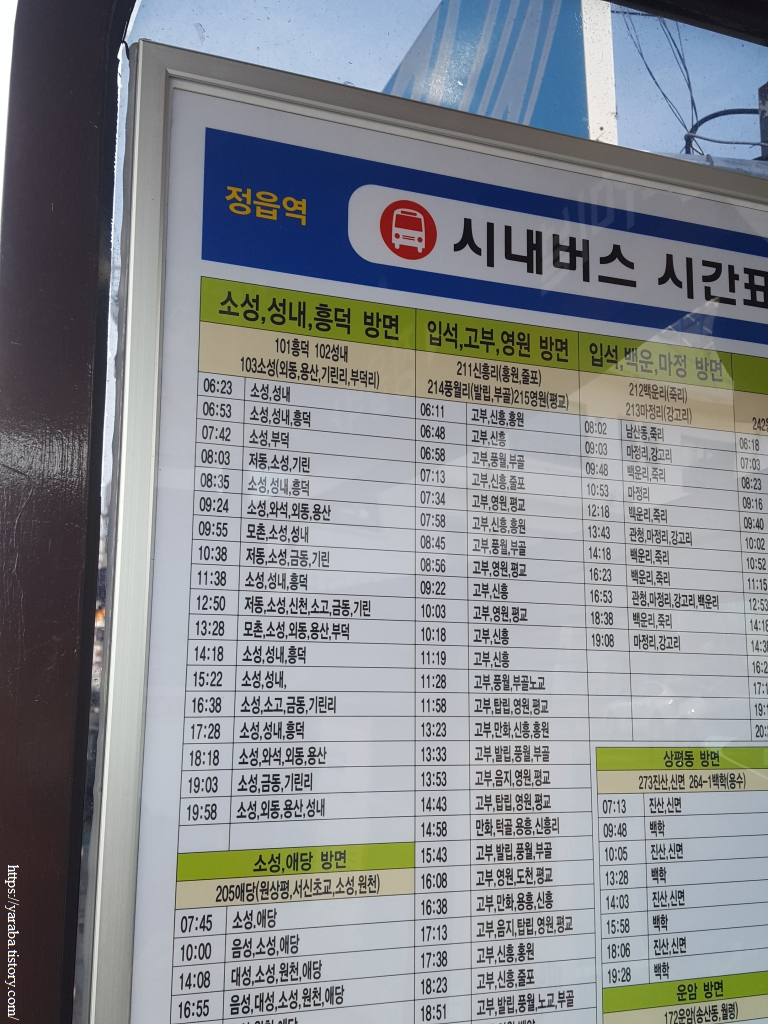 생각해 보면 대중교통을 이용한다면 다음 코스가 시작되는 심원면사무소까지 오려면 정읍에서 흥덕을 거쳐 들어오는 것이 빠른 경로이다. 정읍역 앞에서 시내버스를 이용해서 흥덕으로 올 수도 있고 정읍 터미널에서 시외버스를 이용할 수도 있다. 다음 여행을 위해서 시간표를 남겨둔다.