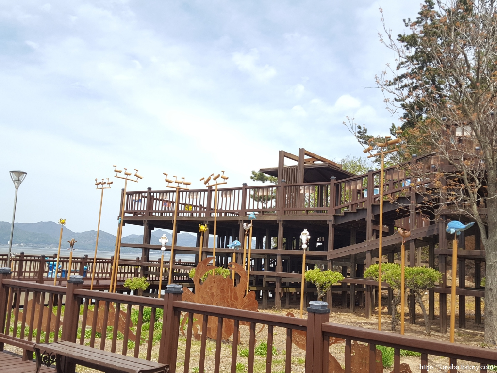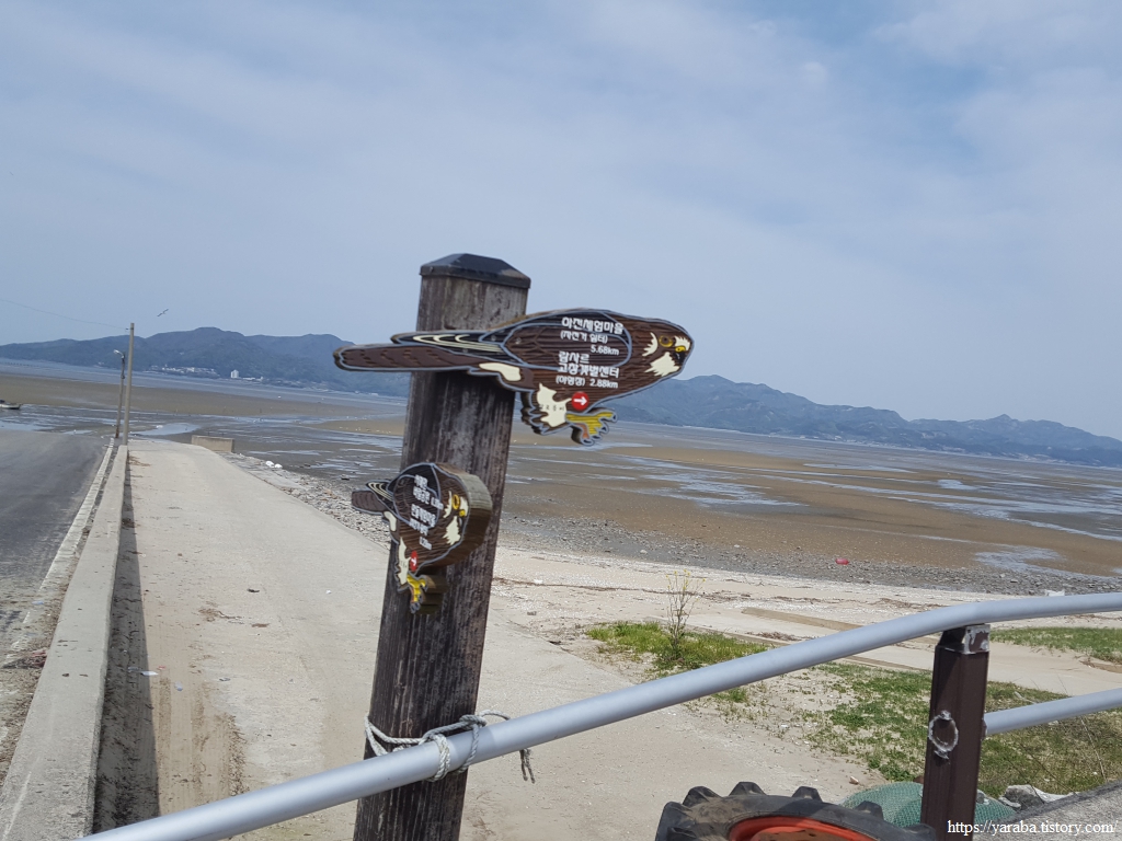 제방에 마련된 산책길을 걷고 있는데 방송에서만 보던 갯벌로 사람을 실어 나르는 트랙터의 그림을 본다. 갯벌 체험을 위해 사람들이 모인다는 것 자체가 신기하기도 하다.