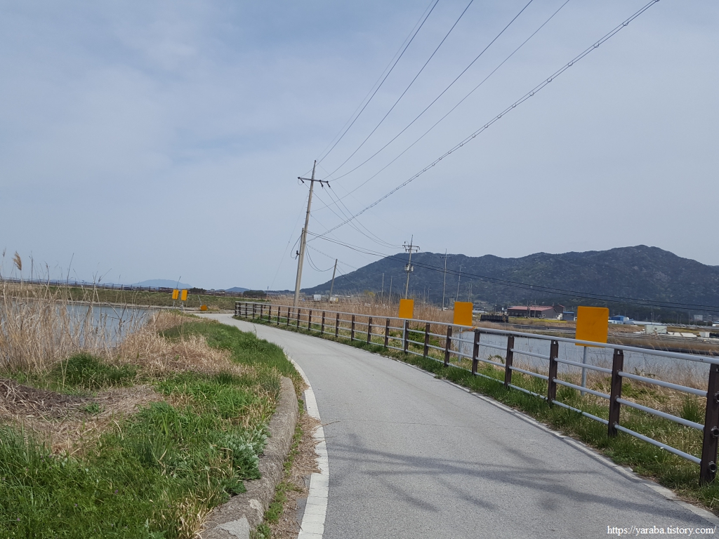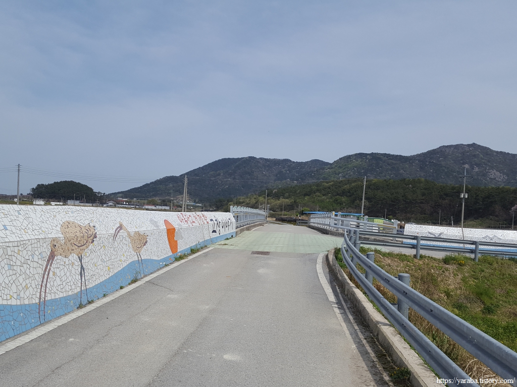 새 모양의 길표지가 등장했다. 종점 인근의 람사르 고창갯벌센터가 약 3Km 남았다. 계명산을 내려온 길은 해안길을 따라 동쪽으로 이동한다.