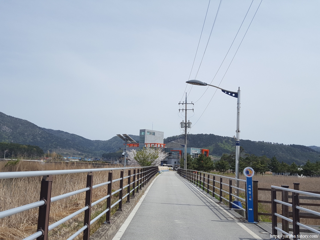 갯벌센터가 5백여 미터 남은 지점, 서해랑쉼터 표식도 등장했다. 서해랑쉼터는 서해랑길을 걸으며 가끔씩 만나는 공간인데, 우리는 잘 활용하지만 않지만 표식만으로도 반갑다.