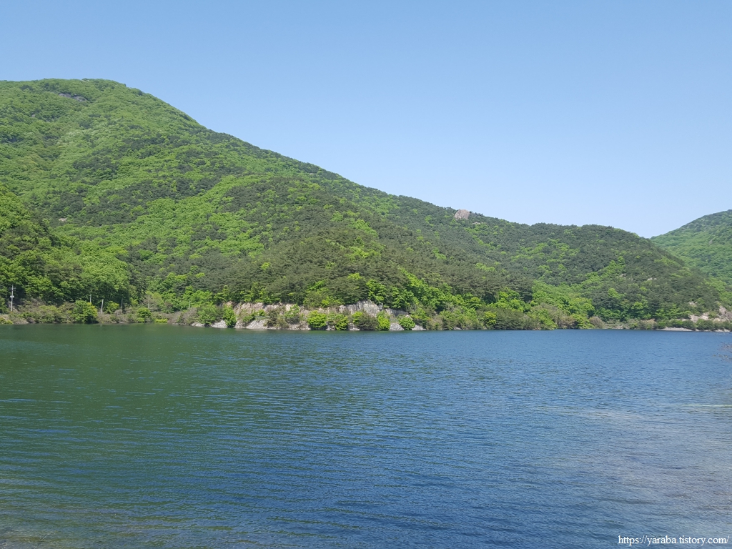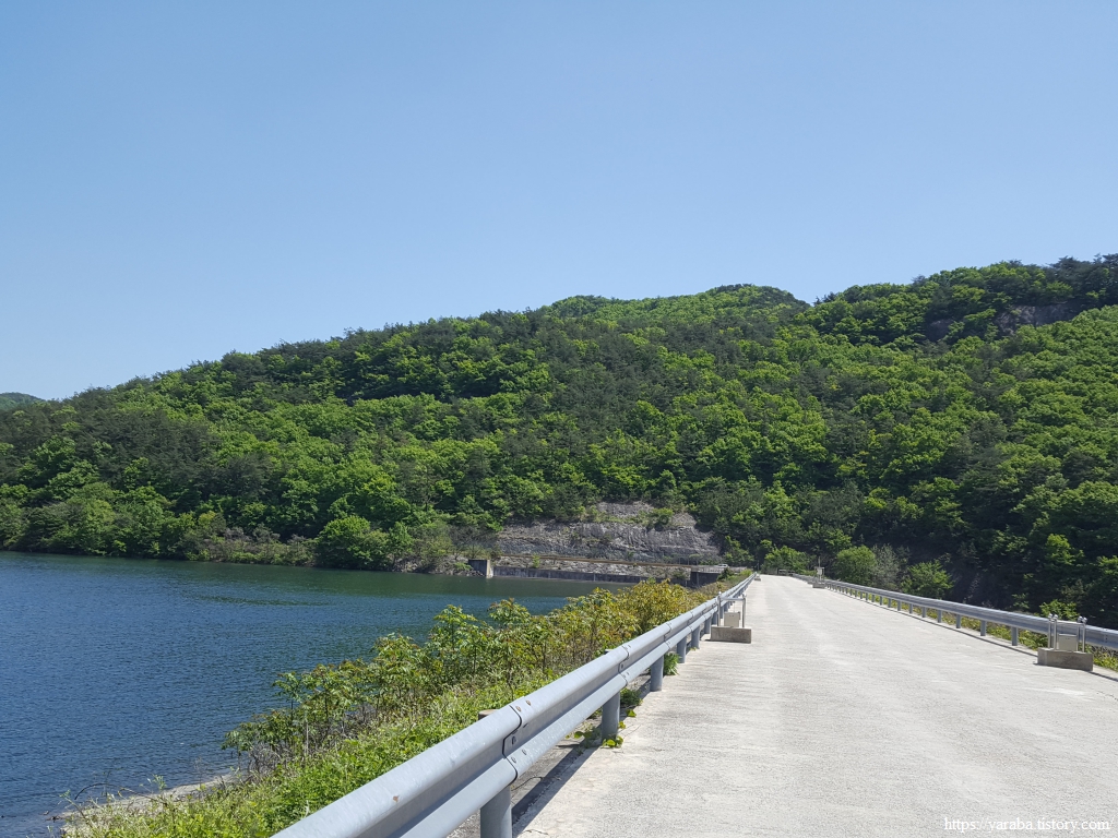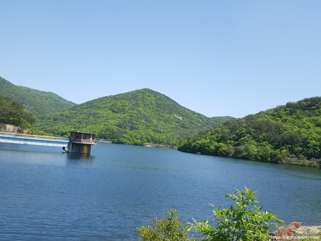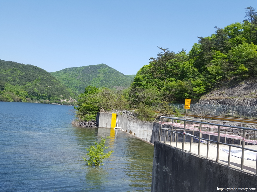 물이 상당히 맑아 보인다. 산에서 내려온 물을 모아 놓은 것이라 역시 간척지에 만들어진 담수호와는 차원이 다르다. 여수로 입구에 뿌리를 내린 나무 한그루가 어떻게 뿌리를 내렸는지 신기하다. 아마도 물이 빠졌을 때 자리를 잡았는데 지금은 물이 불어난 상태가 아닌가 싶다. 앞으로도 계속 생존할 수 있을지 모르겠다.
