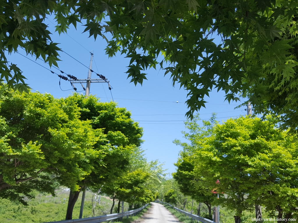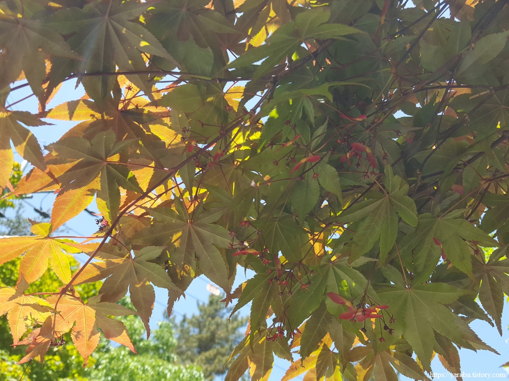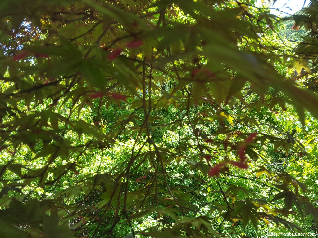 단풍나무에 올망졸망 빨간 열매가 맺혔다. 떨어지면 헬기콥터처럼 날개가 돌아가며 멀리 씨앗을 퍼트리는 신기한 모양의 열매를 가졌다. 단풍나무 그늘 아래에서 잠시 목을 축이고 길을 이어간다.
