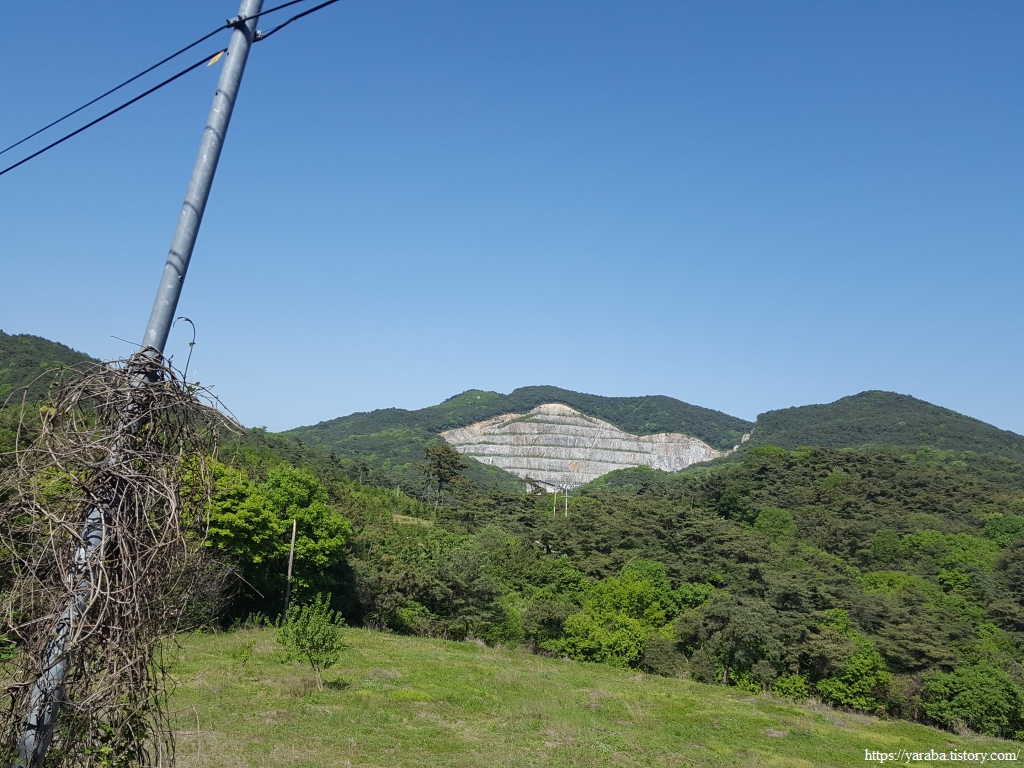 질마재 고개로 내려가는 길, 동쪽으로는 창내저수지가 보이고 산을 파내고 있는 커다란 채석장도 보인다. 수도권을 비롯한 도시의 대규모 주택 공급은 모래, 자갈을 비롯한 골재를 필요로 하는데 하천 골재로는 수요를 감당하지 못하니 전국 곳곳에서 벌어지는 석산 개발은 도시화가 진행될수록 필수 불가결과 사업이 아닌가 하는 생각도 든다. 예전과 달리 촘촘한 허가제 관리가 이루어 지고는 있지만 깊은 산속에서 하얀 속살을 드러낸 산을 보면 불편한 마음은 어쩔 수가 없다.