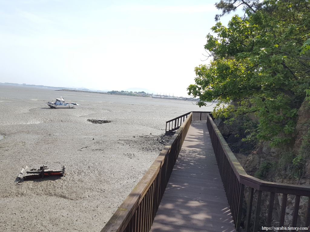 원래의 서해랑길 경로는 반월마을 입구에서 우회전하여 마을 안 길을 거쳐가는 경로지만 걷다 보니 표식을 놓쳐버리고 자전거길과 고창 해안 문화마실길을 따라 해안선 끝자락까지 와 버렸다. 그런데, 어차피 방조제를 지나면 원래의 경로와 합류하기도 하고 길도 좋아서 그냥 가기로 한다. 해안선 끝자락에 짧게 갯벌 위로 데크길을 설치해 놓았다.