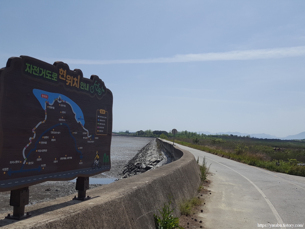 자전거 도로를 따라서 북쪽으로 향하는 길, 곰소만 바다 건너편의 부안군이 시야에 좀 더 가까이 다가온다.