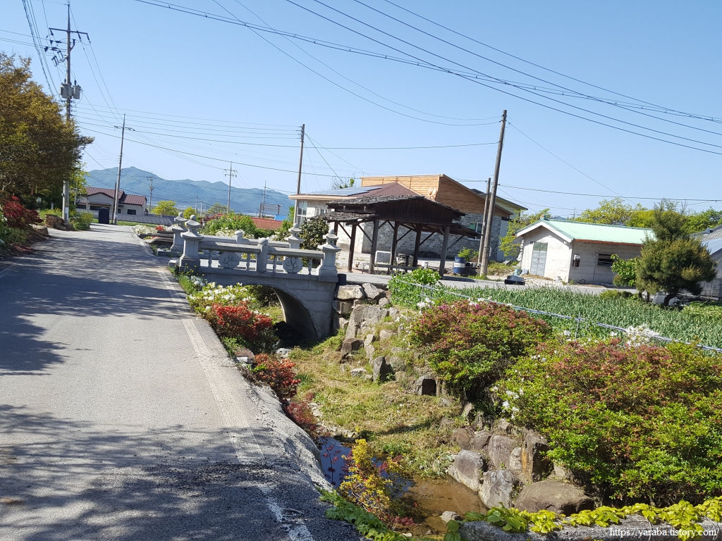 미당의 생가가 있는 곳이라 그런지 마을을 흐르는 수로도 예쁘게 다듬고 나무와 화초를 심어 놓았다. 사실 교과서를 통해서 "국화 옆에서" 시를 접하며 학창 시절을 보낸 필자가 국화 옆에서 일본 천황을 찬양하는 시라는 말을 들었을 때는, "무슨 소리야" 했지만, 노란 황국과 거울이 일본 황족을 상징한다는 구체적인 분석을 접하면서 시야가 완전히 달라지기 시작했다. 반민특위 해산으로 역사를 망치고 온갖 부정부패를 저지른 이승만을 제우스와 단군으로 칭송하고 쿠데타로 정권을 찬탈한 전두환을 "새맑은 나라의 새로운 햇빛"으로 찬양 시를 쓴 기록을 보면서는 "국화 옆에서"가 일본 천황을 찬양하는 친일시라는 그냥 그렇고 그런 주장이 아닐 수 있겠다는 생각도 들었다.