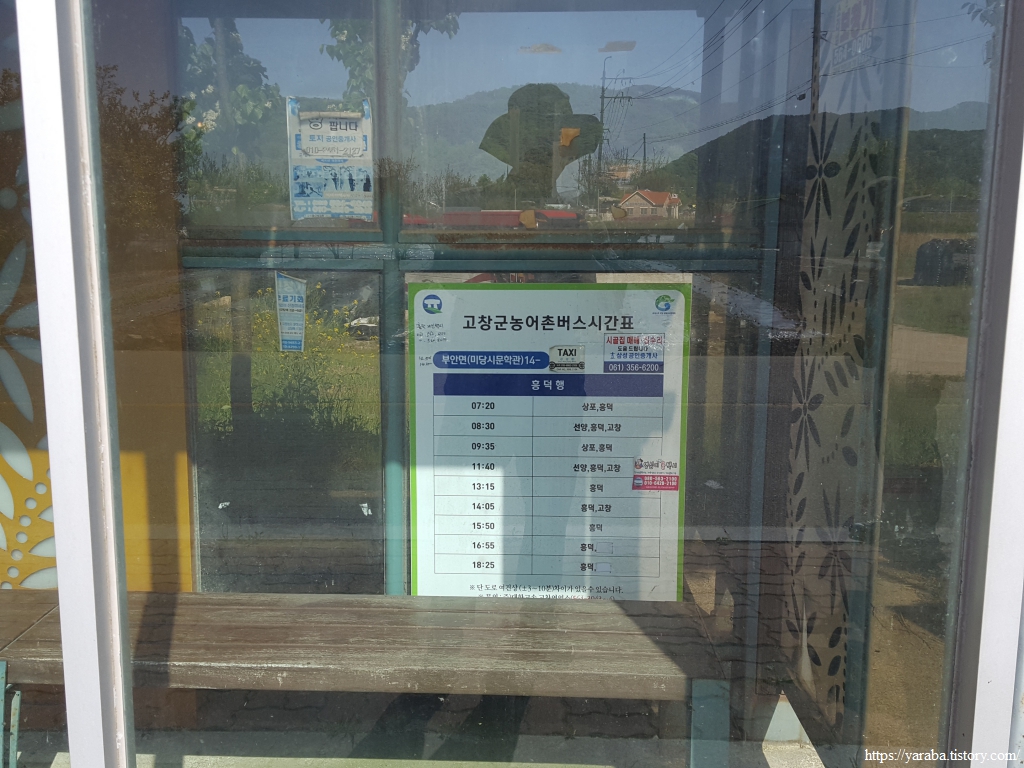 42코스와 43코스 일부를 이어서 걸었던 우리는 선운리 삼거리에 있는 질마재 버스 정류장에서 흥덕행 버스를 타고 흥덕 읍내에서 하룻밤 쉬고 돌아와 여정을 이어간다. 이곳은 흥덕에서 온 버스의 종점이었다. 시간에 맞추어 도착한 버스는 잠시 휴식을 취하더니 버스 기사는 어디서 왔고 어디로 가냐는 말을 하며 버스를 출발시켰다. 기사분의 수다는 승객이 우리 밖에 없던 까닭인지 미당의 친일 행적부터 인촌 김성수의 이야기까지 끝이 날줄 모르고 이어졌다. ㅠㅠ