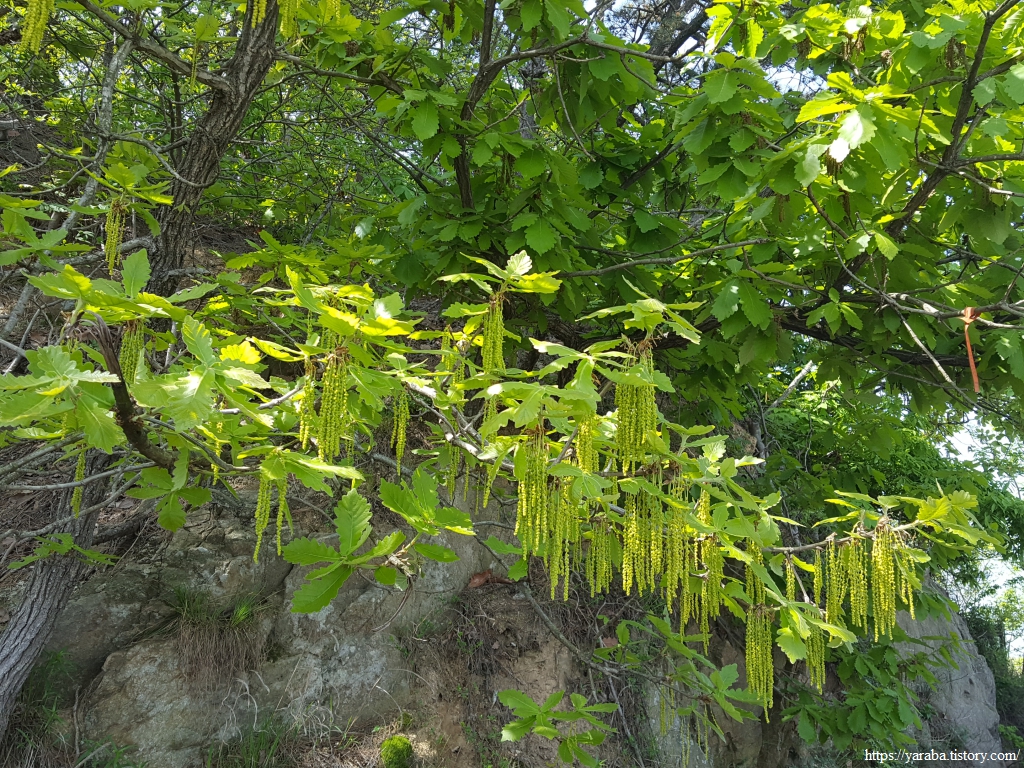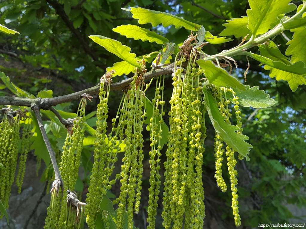 독특한 모양을 가진 참나무가 꽃을 피웠다. 저 꽃이 지고 나면 열매인 도토리가 맺힌다는 것도 상상이 어렵지만, 귀고리처럼 생긴 저 참나무 꽃에서 발산하는 꽃가루가 소나무 꽃가루 보다 독성이 강해서 알레르기를 일으키는 주범이라는 것도 상상이 어렵다. 일반 사람이 알 수 없는 세계가 많다.