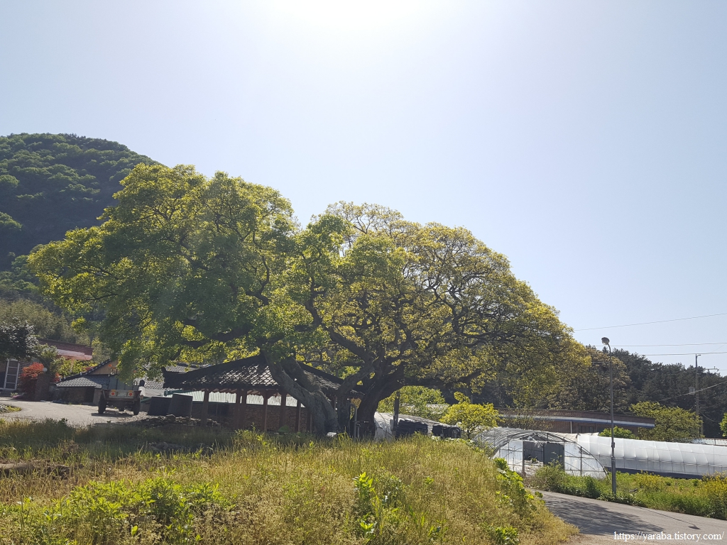 미당 서정주 생가 쪽으로 내려가는 마을길, 마을 정자에 그늘을 만들어 주고 있는 커다란 나무가 마을의 역사를 말해주는 듯하다.