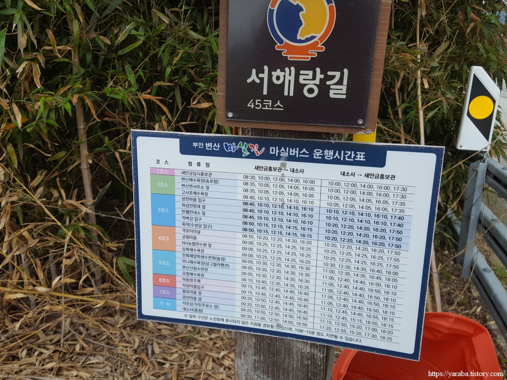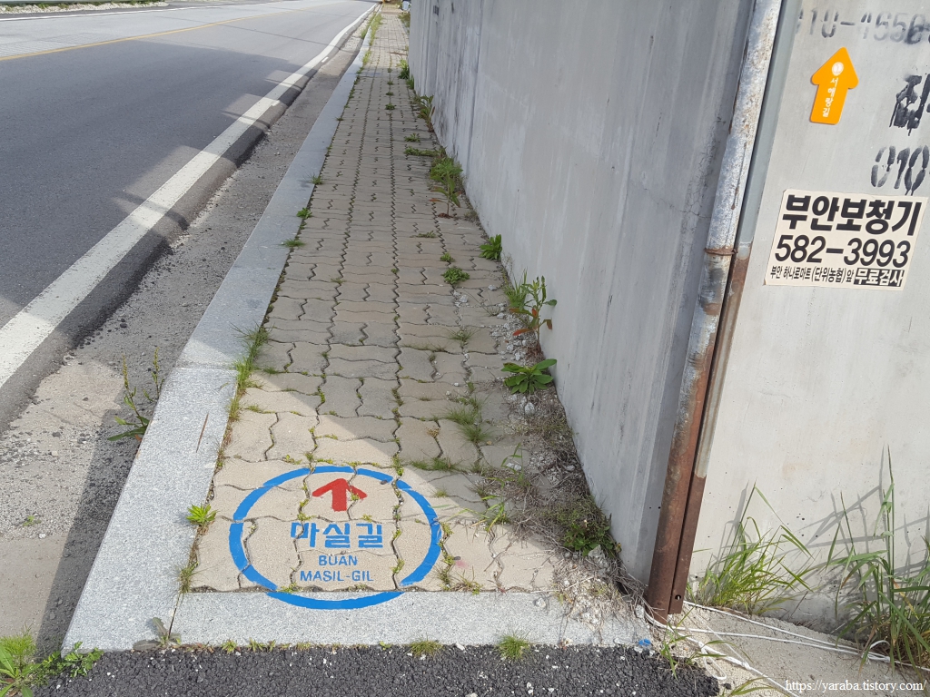 청자로 도로를 따라서 관선마을 지나온 길은 왕포마을 표식을 따라서 다시 해안길로 내려간다. 주말과 공휴일에만 운행하기는 하지만 부안 변산 마실길을 따라 운행하는 마실버스를 잘 활용하면 비싼 택시비를 지불하지 않고도 걷기 여행을 편한 게 할 수 있다.